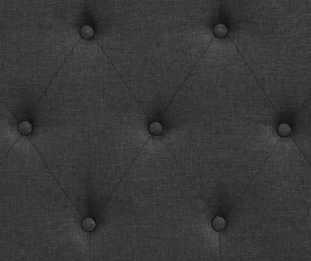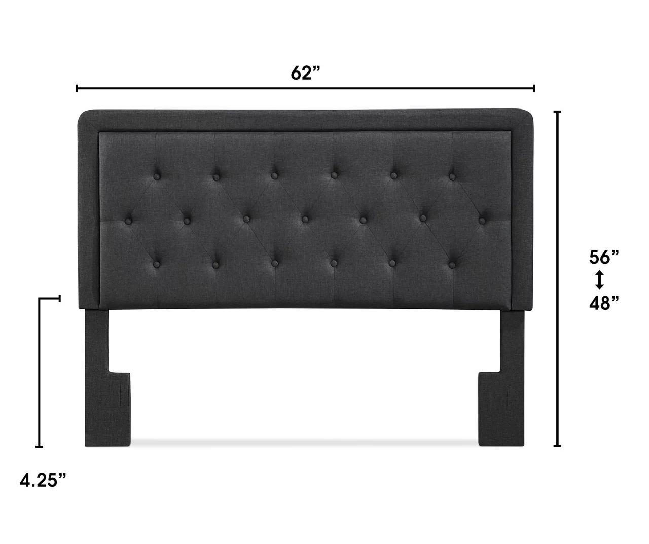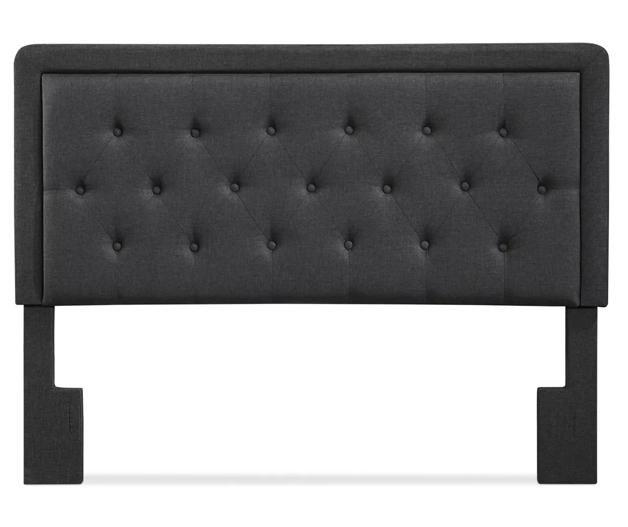 - Charcoal gray tufted fabric headboard with a black rounded-corner border