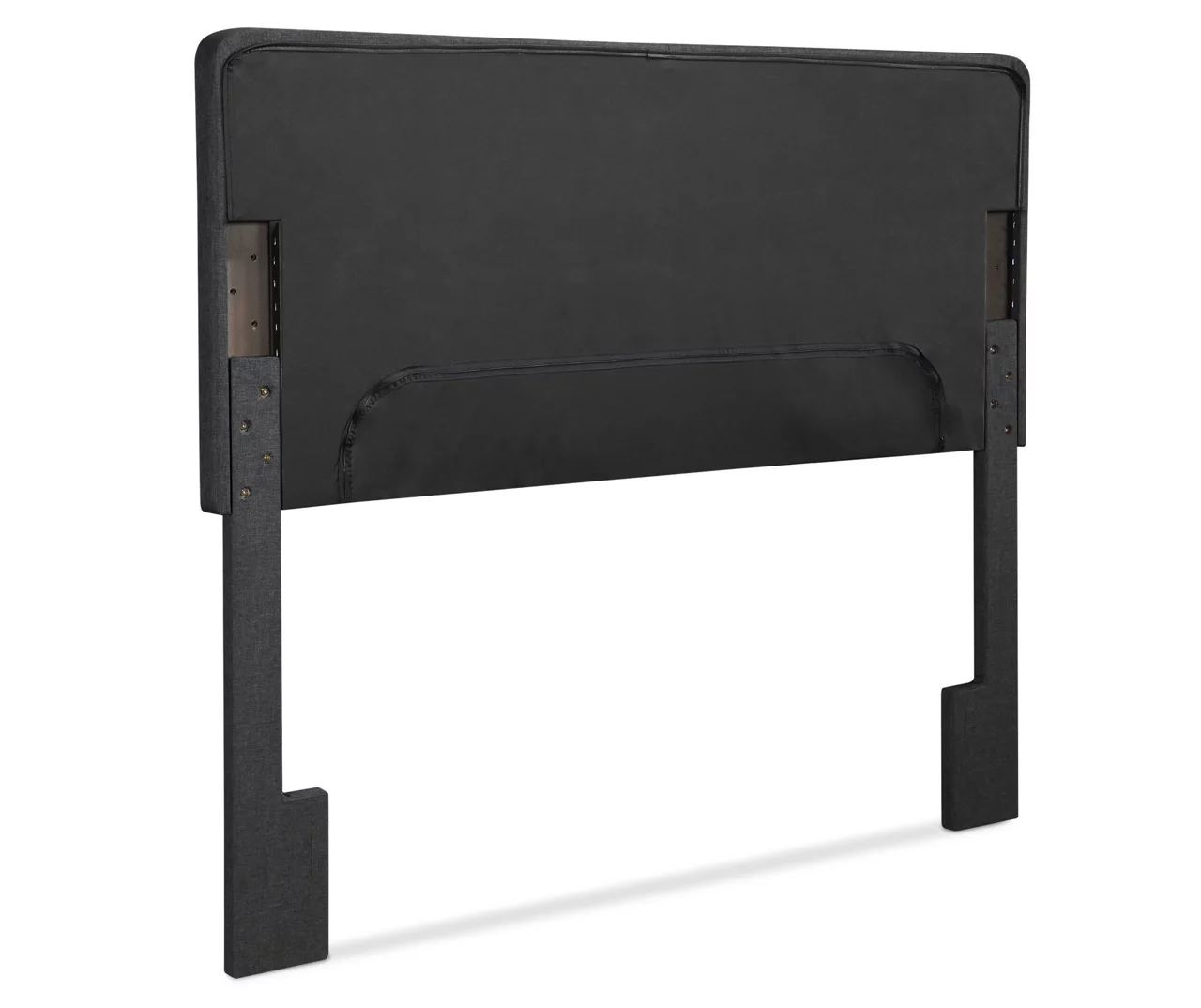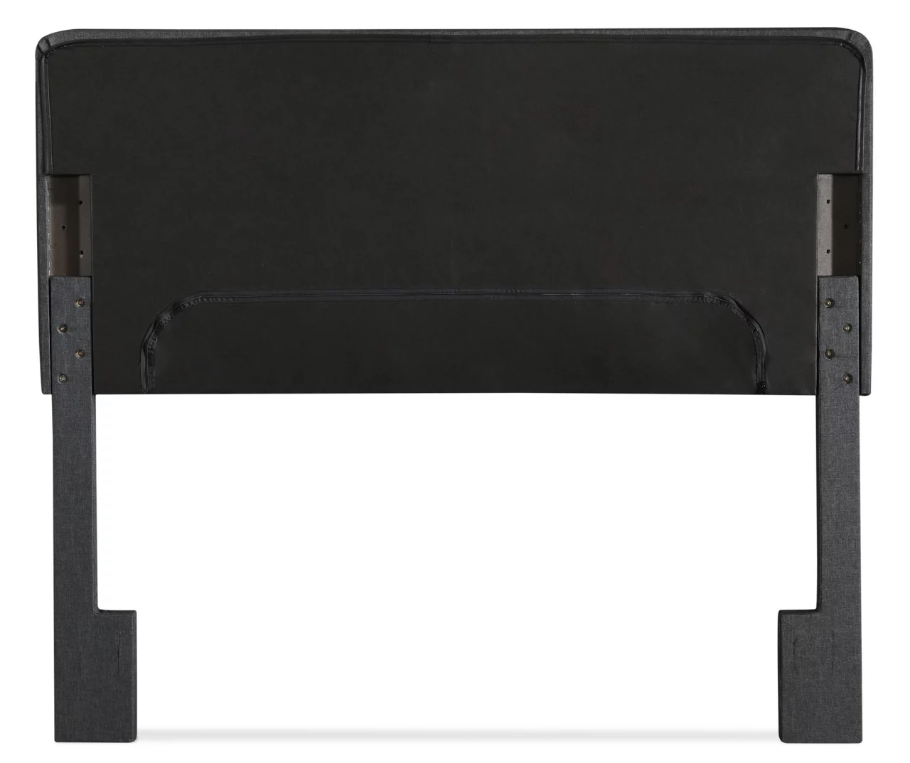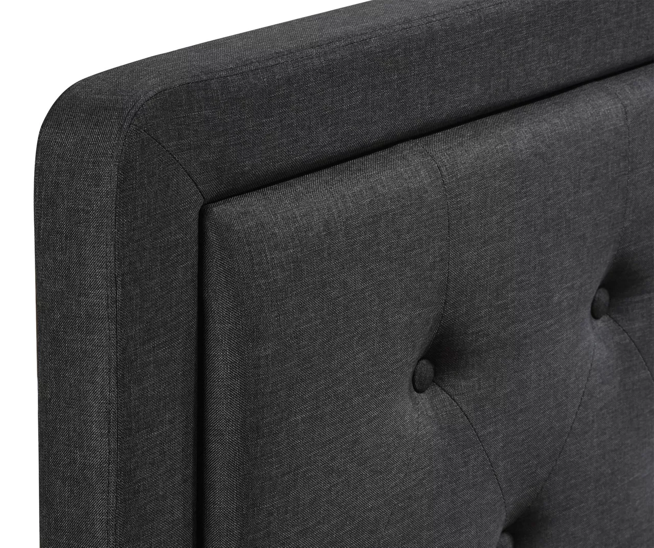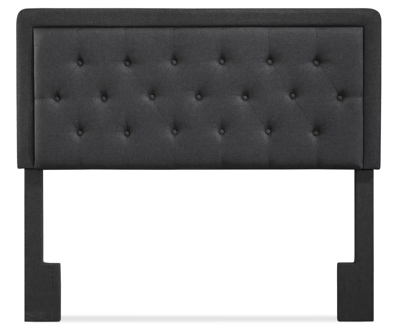 - Charcoal gray tufted fabric headboard with a black rounded-corner border