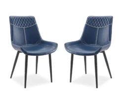 Chic and sophisticated, this set of chairs feature a sleek silhouette accented with white baseball stitching and a rich, blue faux leather upholstery. The curved scoop seat offers a cozy, comfortable feel the supple upholstery ensures long-lasting beauty and durability. Ideal in a modern, industrial or contemporary setting, this stool perks up any space with it bold color, dynamic shape and appealing feel.