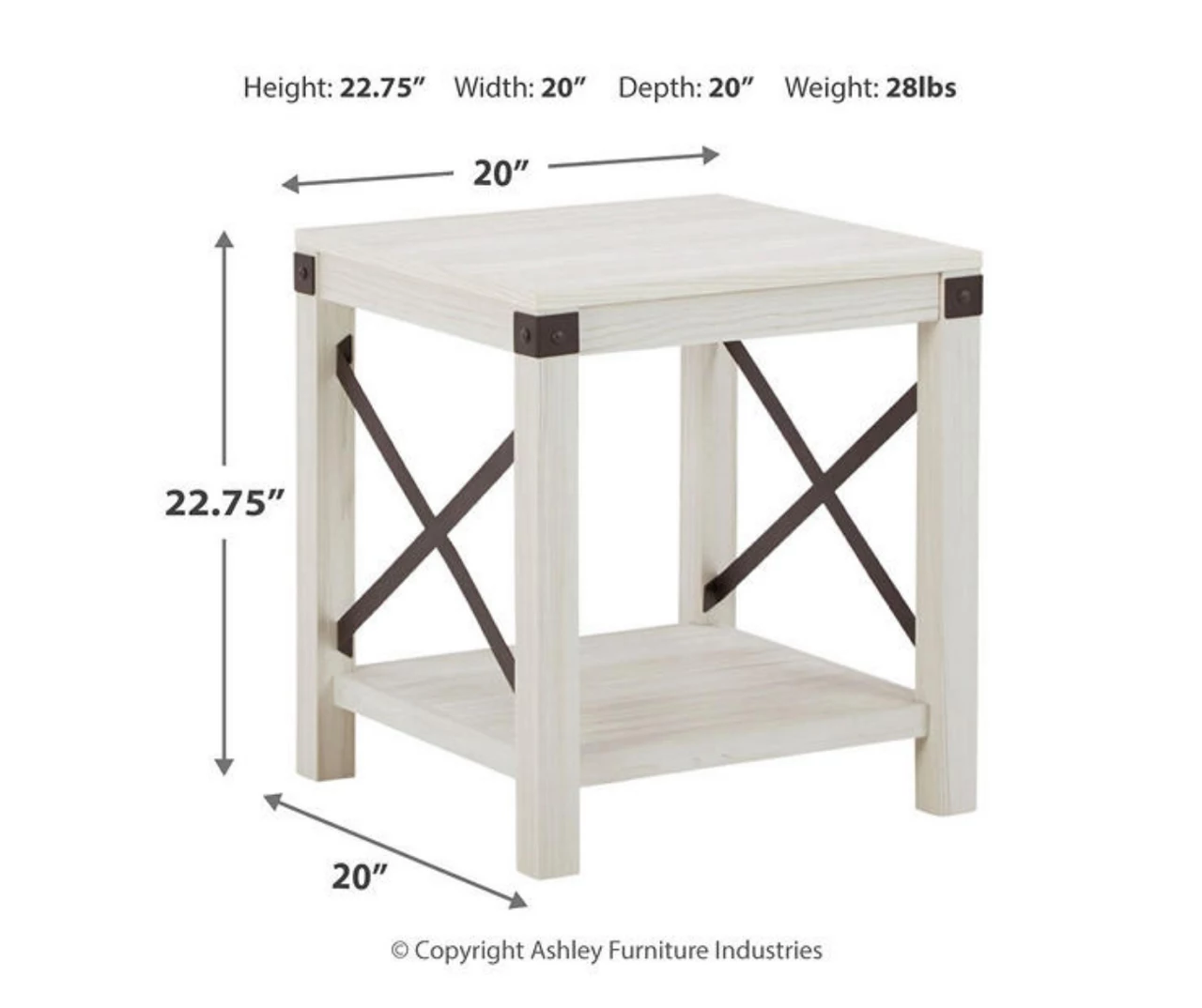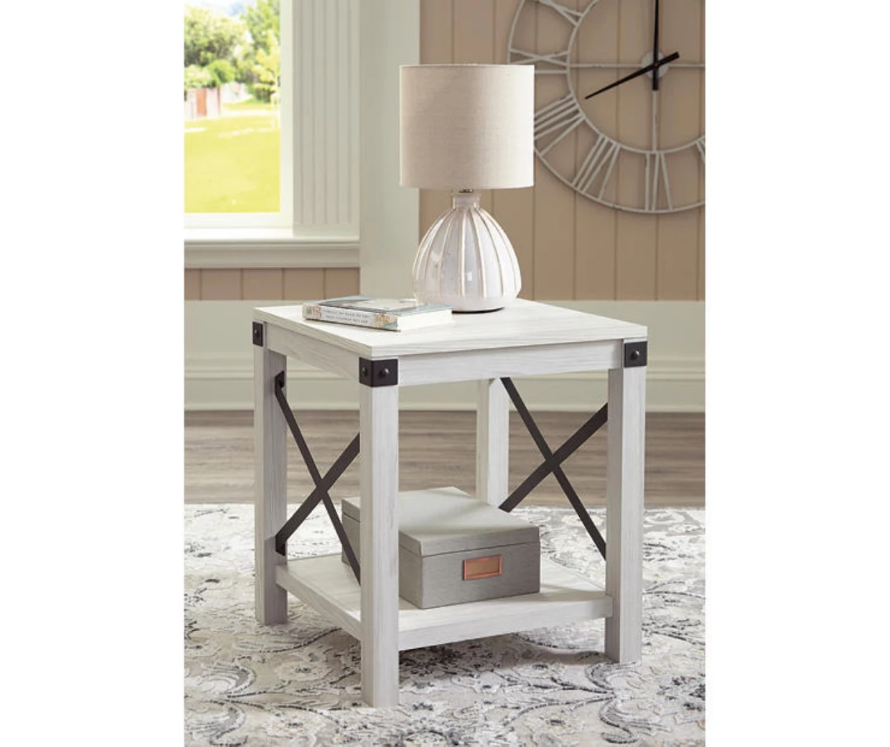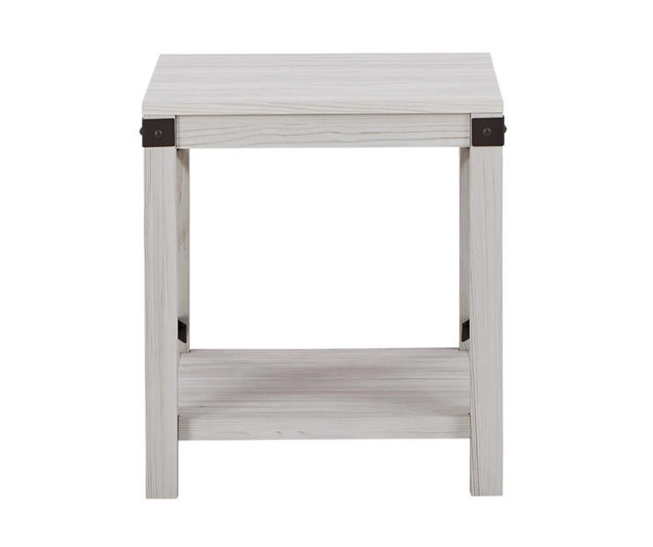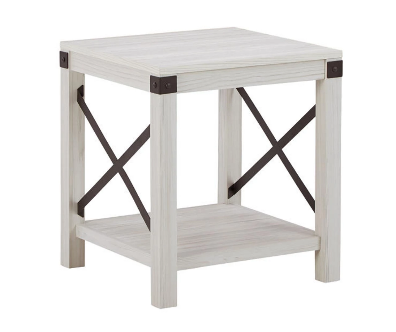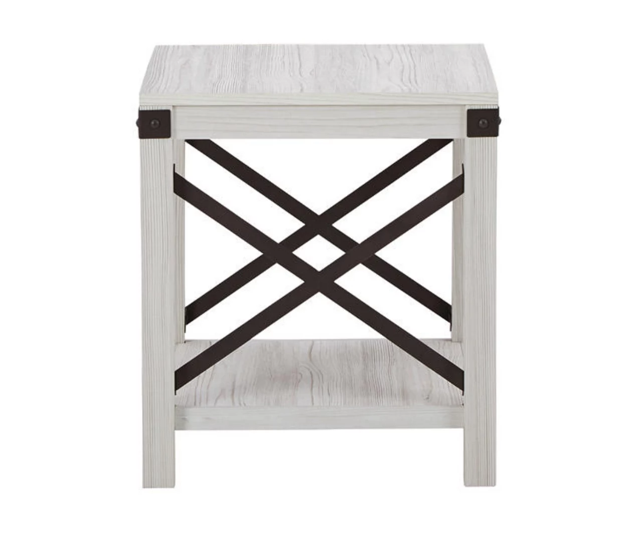 Entertain with ease with this casual, contemporary end table. Designed for the modern tastemaker, the minimalist design wows with crossbuck metal accents and a laminated surface with a whitewashed effect. An open display shelf provides ample space for books and baskets, or for showcasing your special decor accessories.