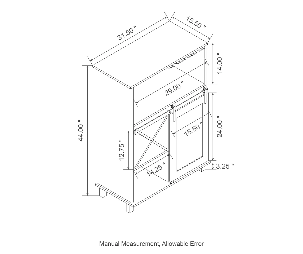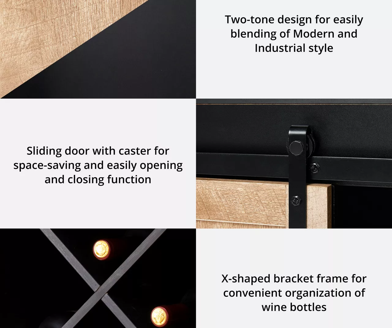 This two-toned abstract wine cabinet provides spacious storage for your dining accessories and wine collection. A built-in wine rack lets you store up to four bottles of your favorite wines as the sliding barn door moves to reveal shelved storage for plates, serve ware and handles of your preferred spirits. The wine glass hanging rack can display up to nine glasses.