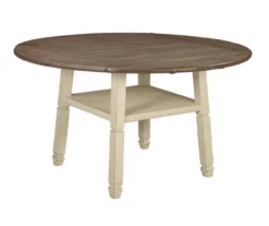 Whether your style is farmhouse fresh or country cottage, you’ll find this drop leaf counter-height table works on so many levels. A two-tone textural finish gives this dining table with a plank-effect top a double helping of charm. Since all four sides fold, you can go from a round table that seats six, to a compact square design in no time. Built-in display shelf serves up form and function.