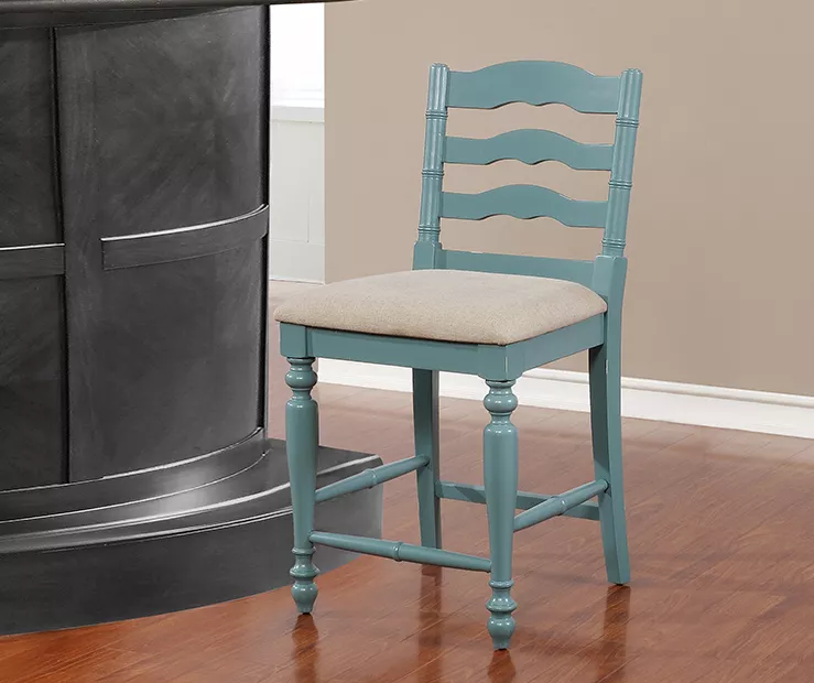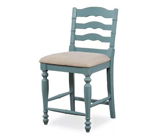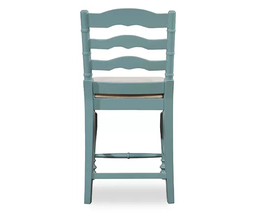 Give your home a traditional touch with this counter stool featuring classic design elements and antique blue finish. Beautifully turned legs, curved back and elegant detailing gives this stool a timeless look that suits formal and casual spaces with ease. Perfect for a variety of styles from farmhouse to traditional, this stool features a padded seat and foot rests for comfort and stability.