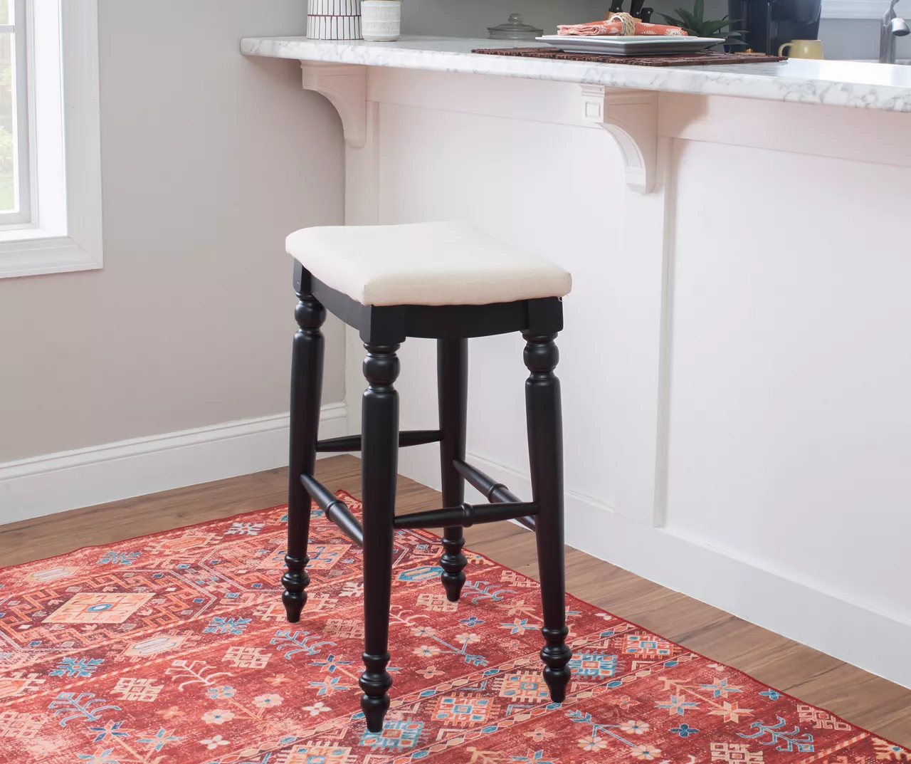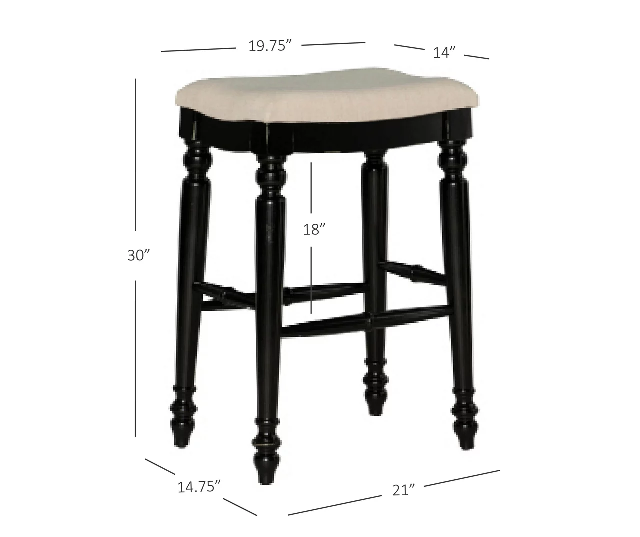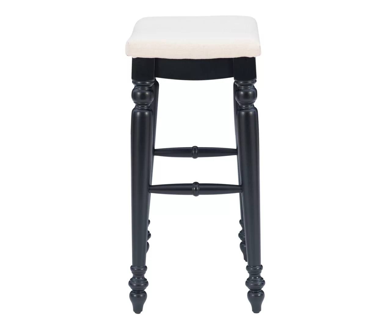 Beautifully turned legs and ivory upholstery give this backless bar stool a traditional look that elevates the design of any home, while the gleaming black finish contrasts with the neutral linen upholstery. This stylish stool blends a classic elegance with sturdiness and comfort thanks to a padded seat and foot rests. Ideal for any home bar, kitchen island or breakfast nook, this stool introduces a timeless look complements any home.