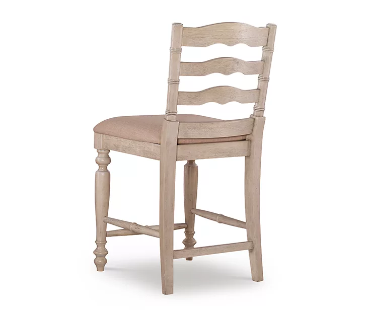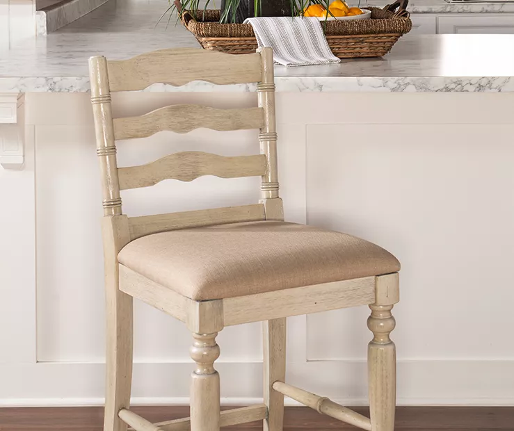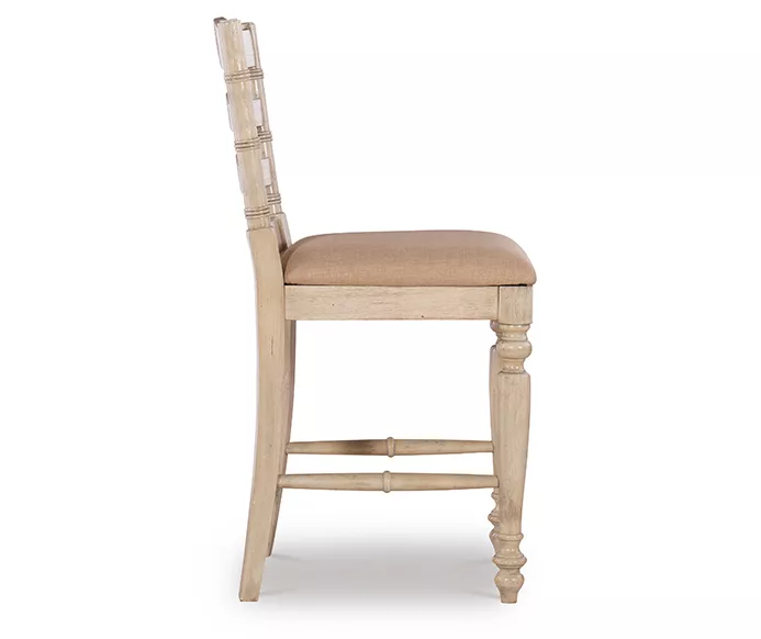 Give your home a traditional touch with this counter stool featuring classic design elements and antique white wash finish. Beautifully turned legs, curved back and elegant detailing gives this stool a timeless look that suits formal and casual spaces with ease. Perfect for a variety of styles from farmhouse to traditional, this stool features a padded seat and foot rests for comfort and stability.