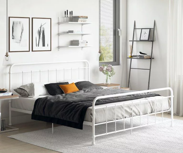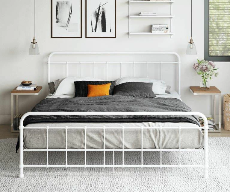 The timeless design of the DHP Brooklyn iron full bed is versatile enough to furnish a kids and master bedroom in chic style. Its curved headboard and footboard present simple lines enhanced with decorative metal accents for a crisp, elegant look. Durable metal framing, side rails and support legs guarantee stability and durability. Metal slats provide further support to the body and mattress. For your convenience, this bed has two base heights — 7″ or 11″ clearance — so it can be used with or without a foundation.