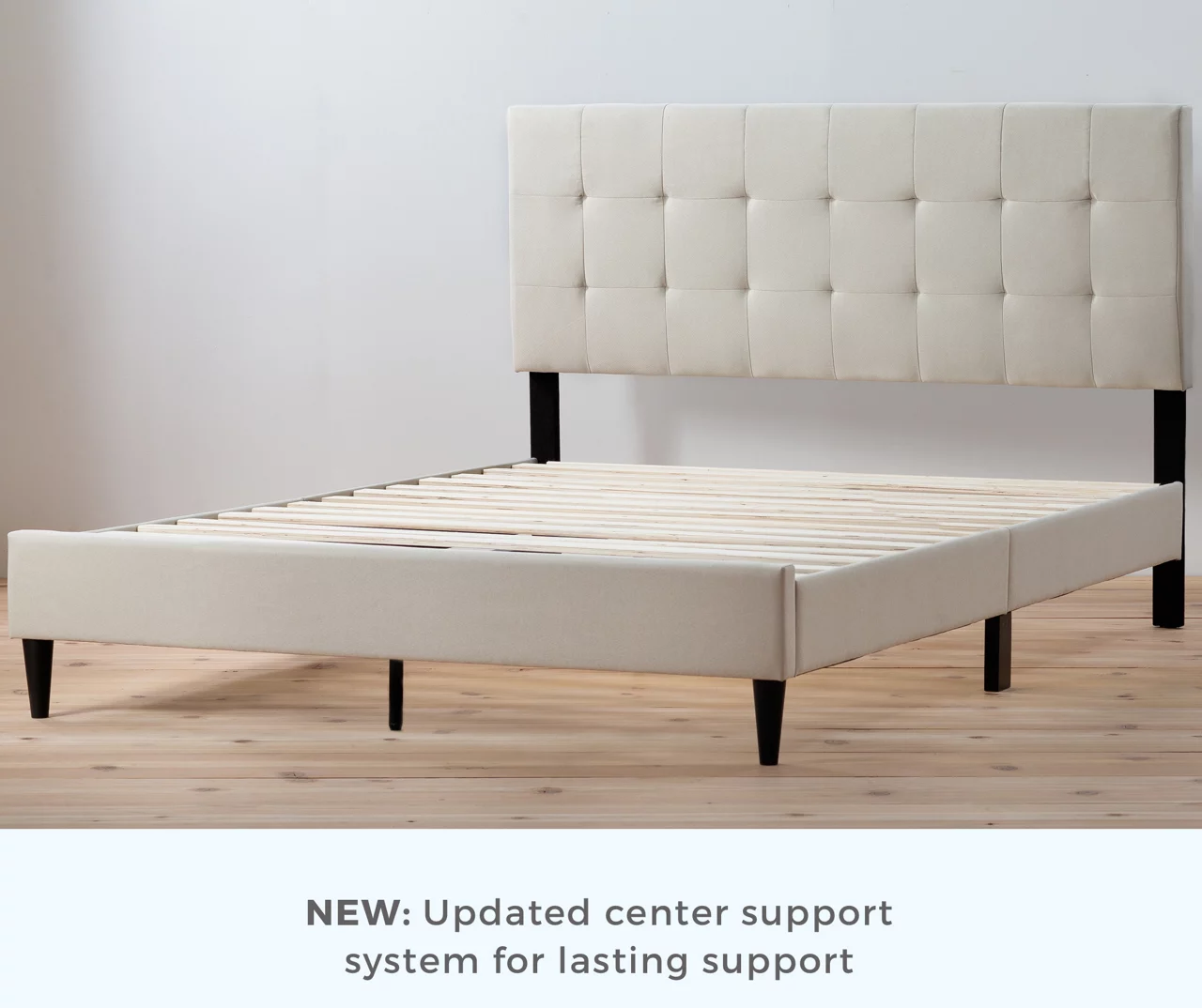 A gorgeous, upholstered finish, a sleek design, excellent support and easy assembly define the Brookside Cara upholstered platform bed. It’s the perfect statement piece to finish any bedroom. Upholstered side rails create an elegant look that matches perfectly with a classic buttonless square tufted upholstered headboard. A new center support system for added durability with included slats that easily unroll to create even, lasting support that eliminates the need for a box spring. Durable and classy legs finish the design for a versatile look that will go well with most styles and preferences.
