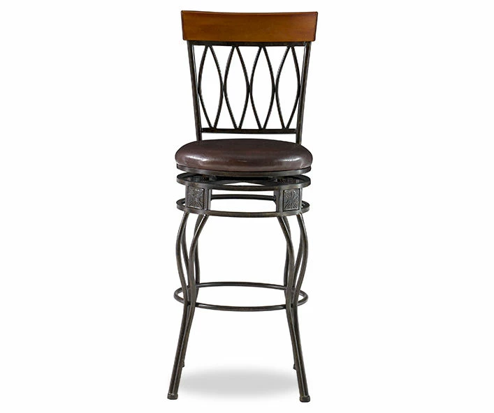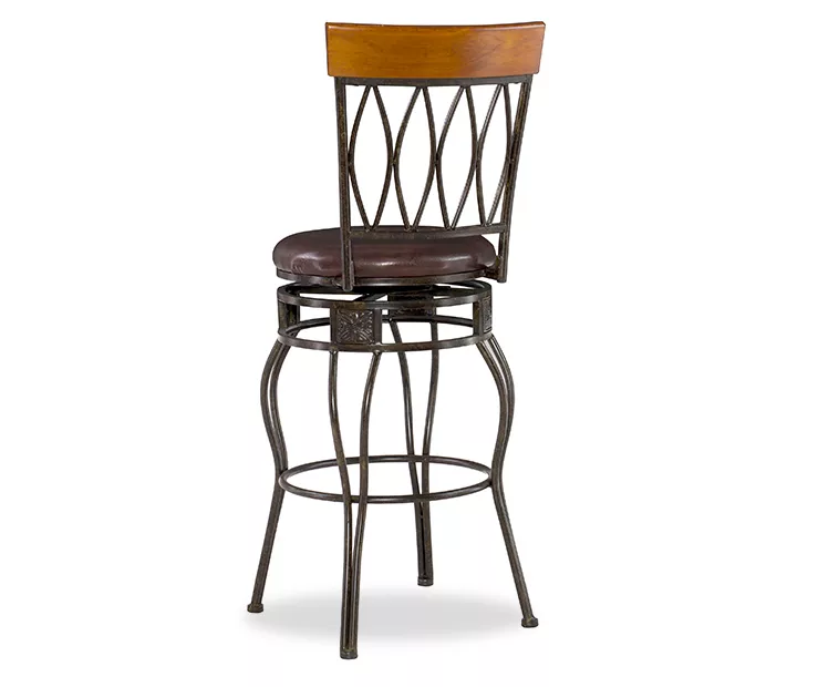 Elegant and distinctive, this bar stool combines rich finishes with a sophisticated silhouette. Add this stool to your kitchen or home bar to enjoy the comfort of thickly padded faux leather, foot rests and smooth swivel motion. Designed for long-lasting beauty and use, this piece features a stable metal frame and durable yet pliable upholstery.