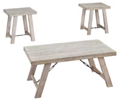 A rustic rendition of modern farmhouse style, this occasional table set is right in tune with your richly relaxed sense of style. The clean yet hearty profile is enhanced with a distressed whitewash finish and offset plank-effect tabletop. Decorative tension bar and nailhead accents add an industrial twist.