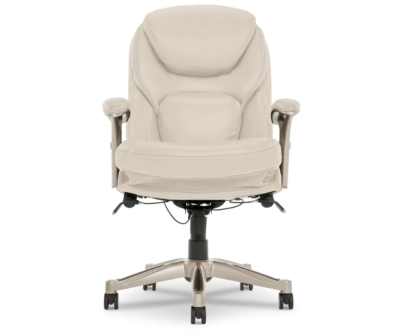 Help promote strength and flexibility in your back while you work with the Serta Back in Motion Executive Office Chair. This ergonomic office chair helps users become more productive and efficient by maximizing lower back support and comfort while seated. Its unique Back in Motion Active Seat Technology swivels the lumbar forward, providing the same effects as a pelvic tilt exercise by promoting spinal movement and flexibility in your core. Push-button adjustable armrests and pneumatic height adjustment allow the leather office chair to be quickly and easily customized to find the right fit for you. The multi-layered cushions are soft yet supportive, so you’ll feel refreshed even after a long day.