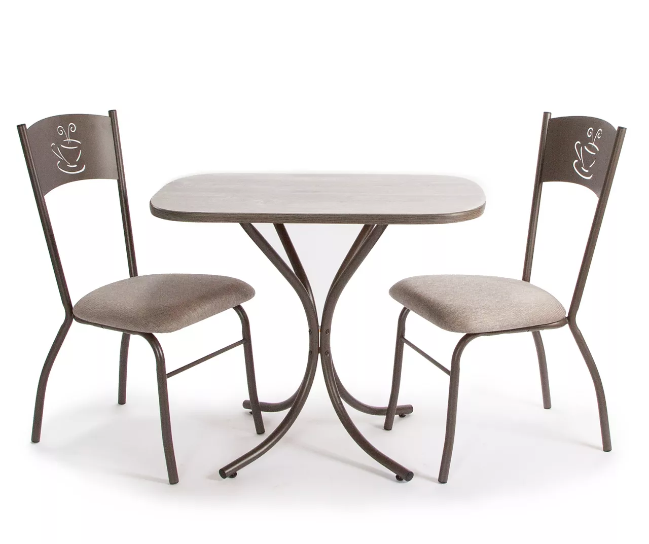 This timeless, coffee cup-accented set is perfect for small space living. Neutral upholstered seats along with a durable wood-look laminate tabletop works well with any color scheme. It’s a wonderful bistro addition to a breakfast nook, kitchen or dining room.