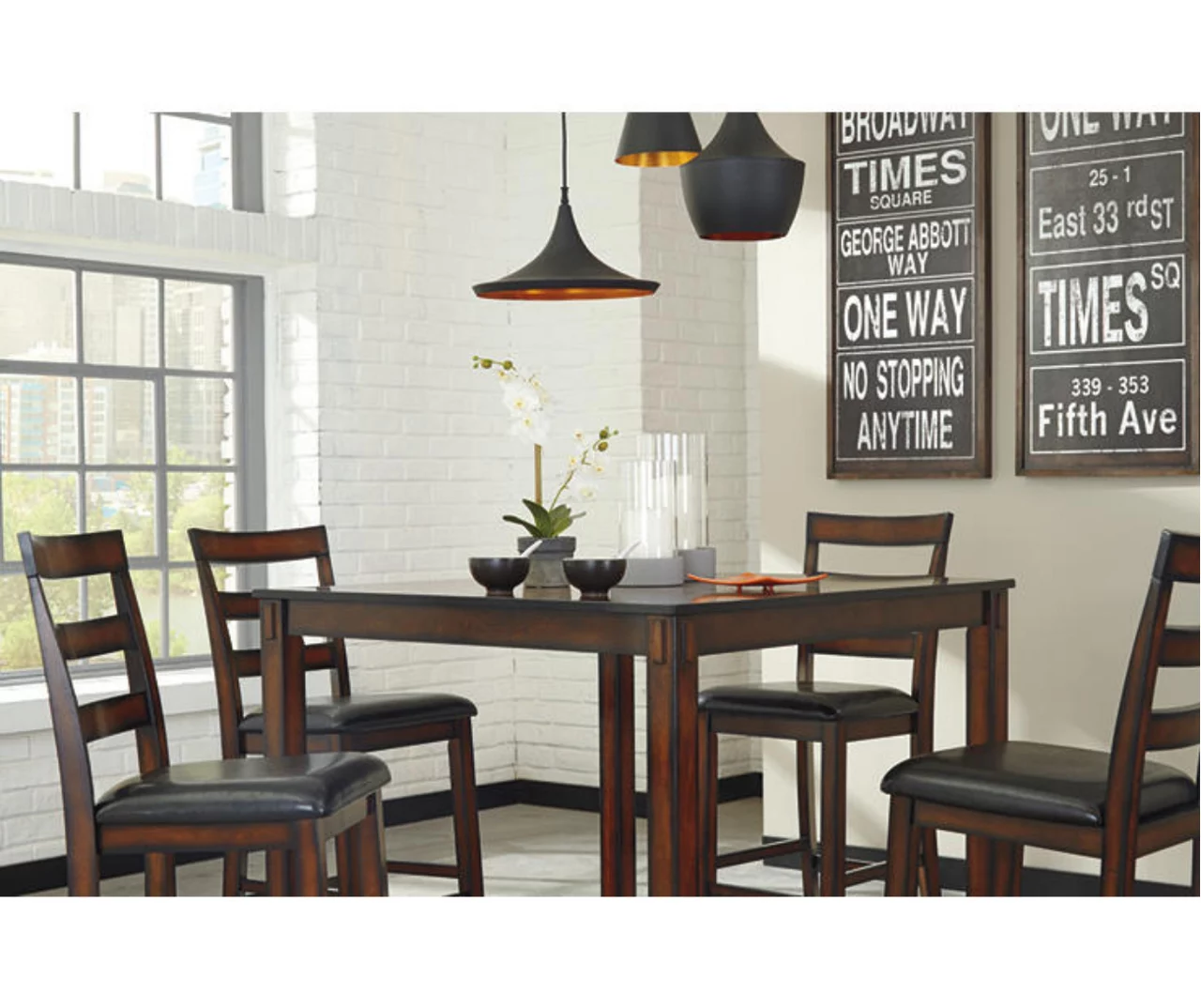 This counter table set raises the bar on how beautiful simplicity can be. A wonderfully clean-lined profile is dramatically enriched with a complex, burnished finish loaded with tonal variation and rustically refined character. Cushioned bar stools in a practical faux leather take a classic ladderback design to a new level of comfort.
