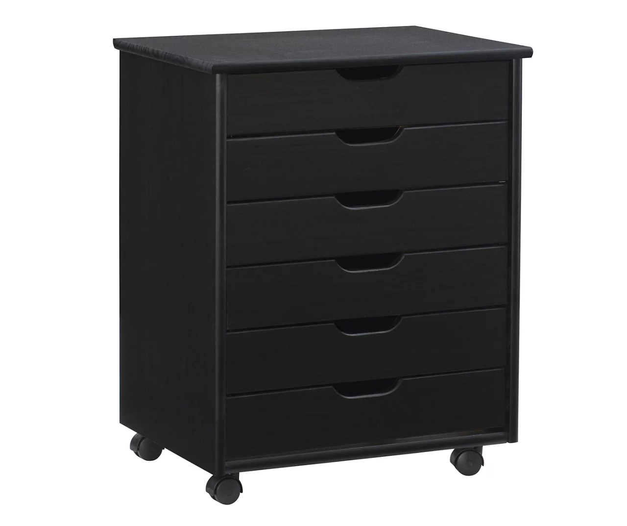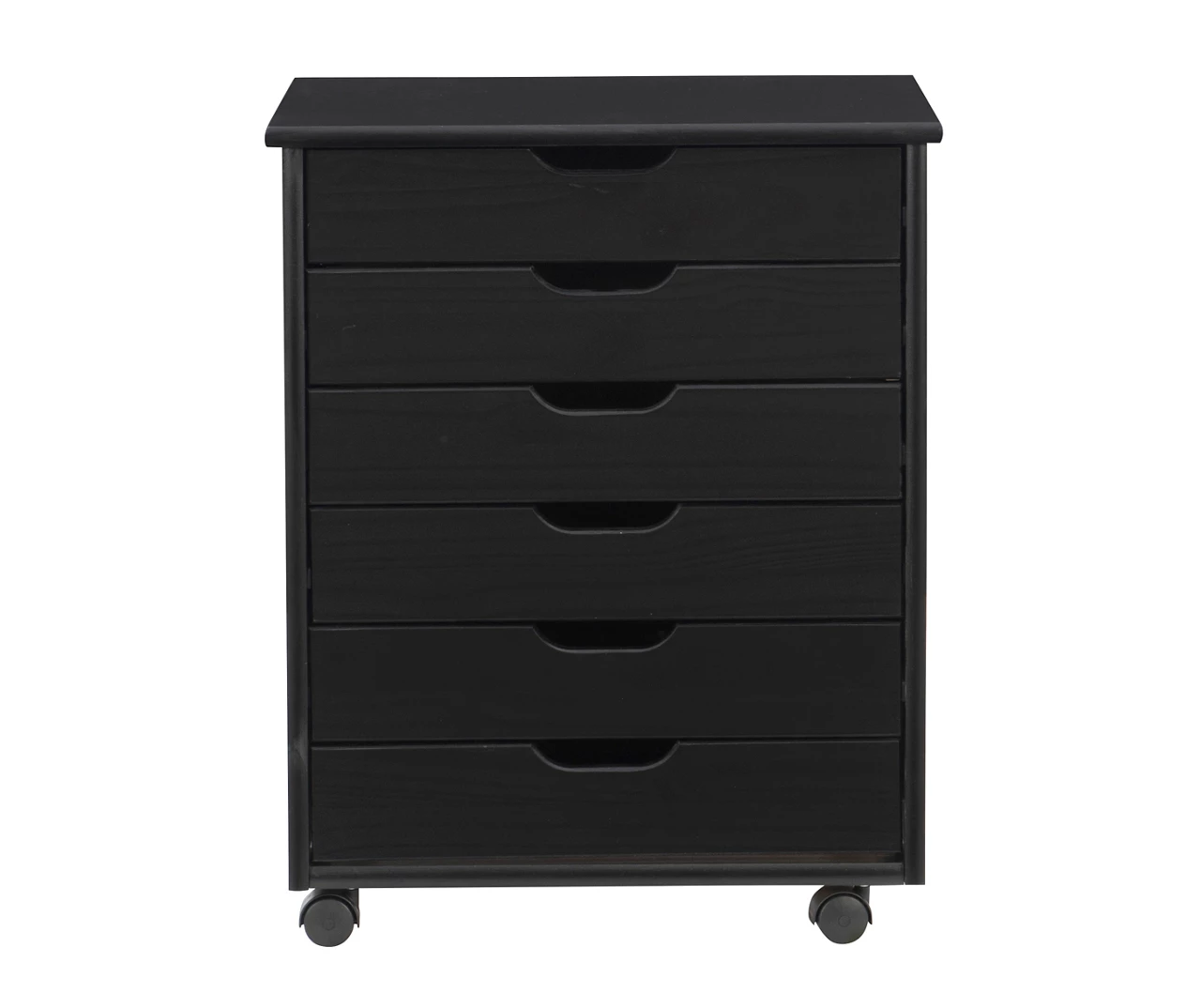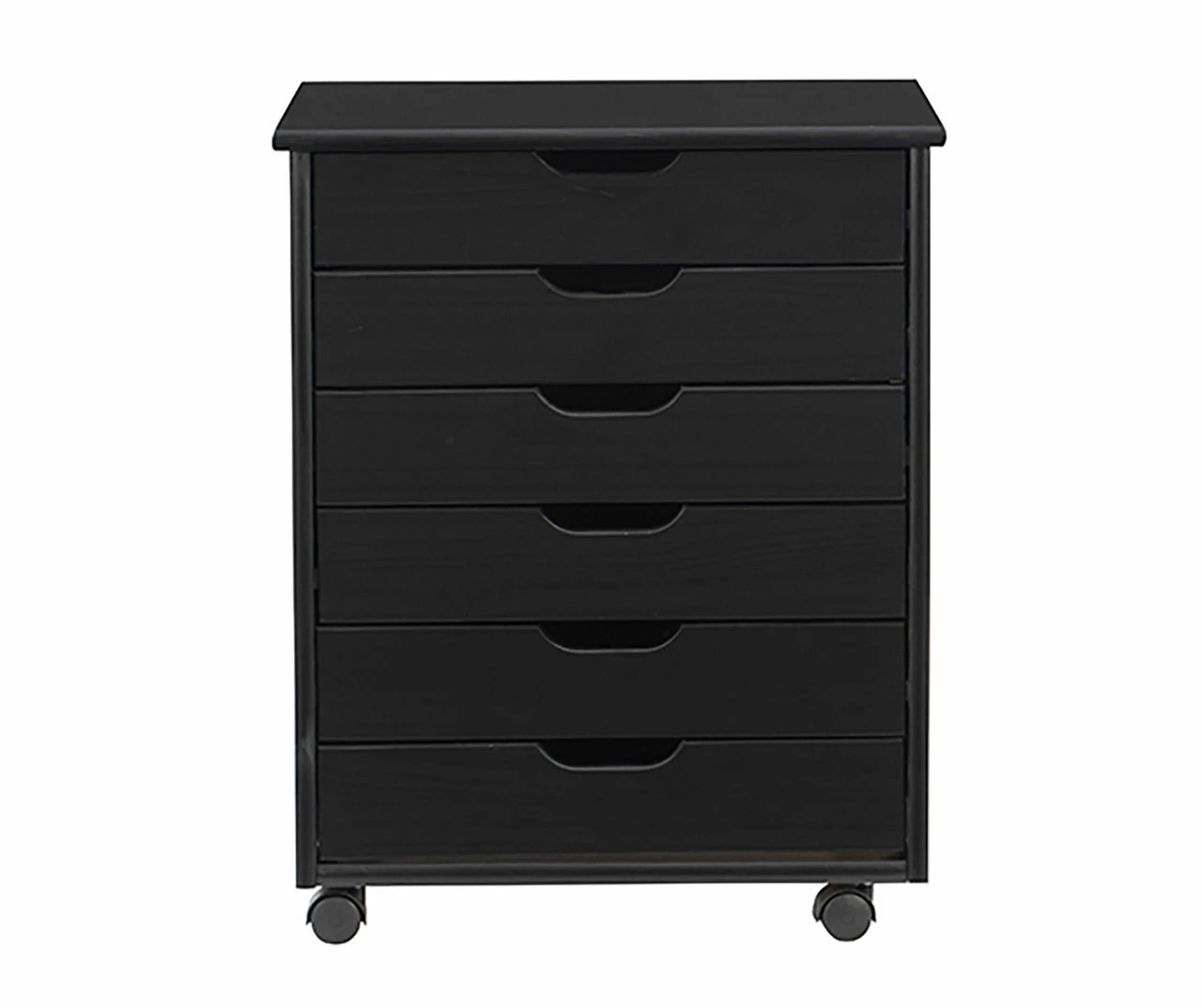 This six drawer rolling storage cart is a versatile storage solution for your office, kitchen, bedroom or anywhere where organization is needed. Solidly constructed from pine wood and finished in a handsome black, the six wide, equal size drawers are finished off with an ample top that can go next to a desk or craft table to put items within reach. Soft contoured handle cut outs are easy on the touch and create a clean, modern look. Drawers can be easily removed and used as a tray to transport your items to your workspace, while casters make this piece mobile to go into any room easily.