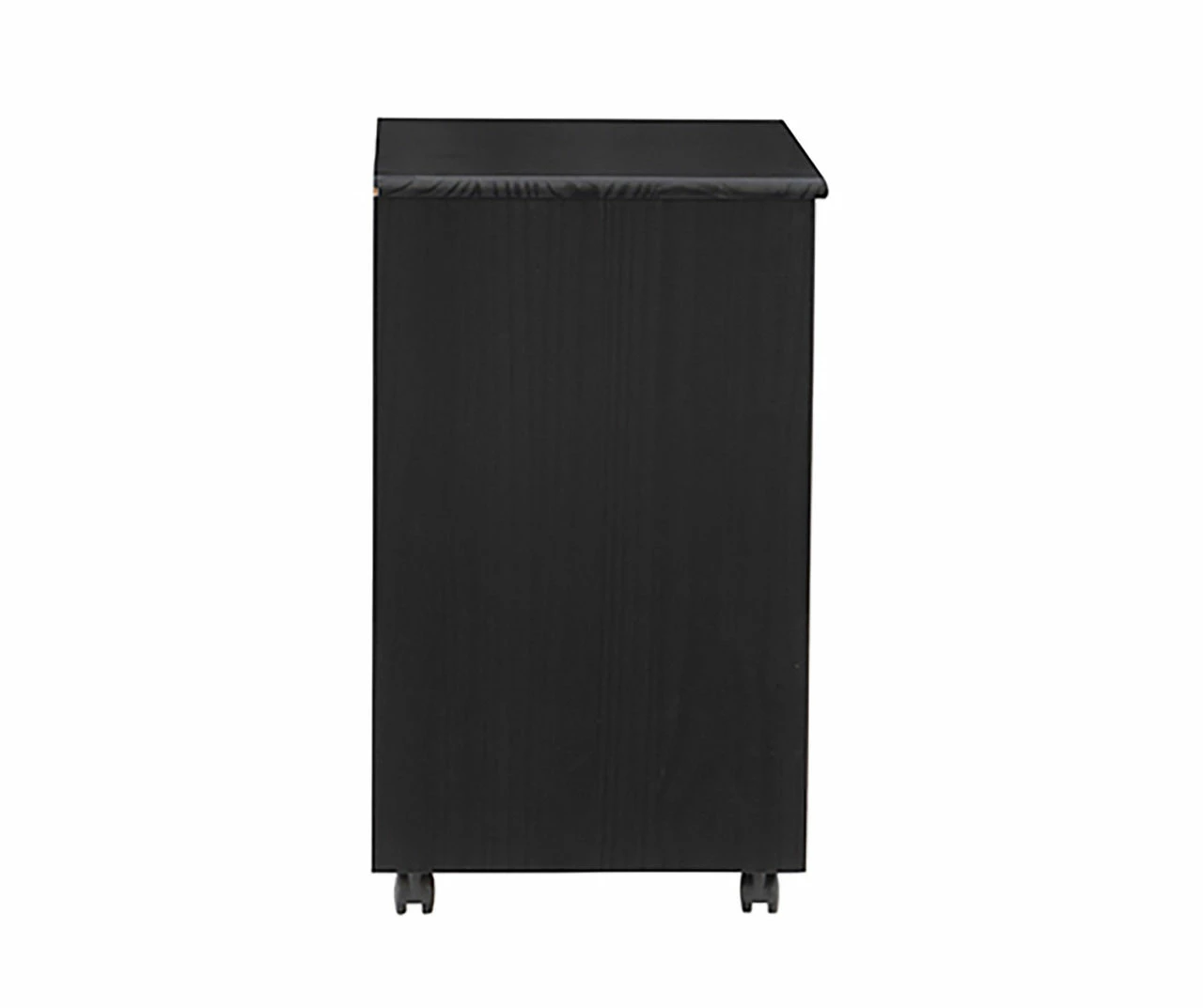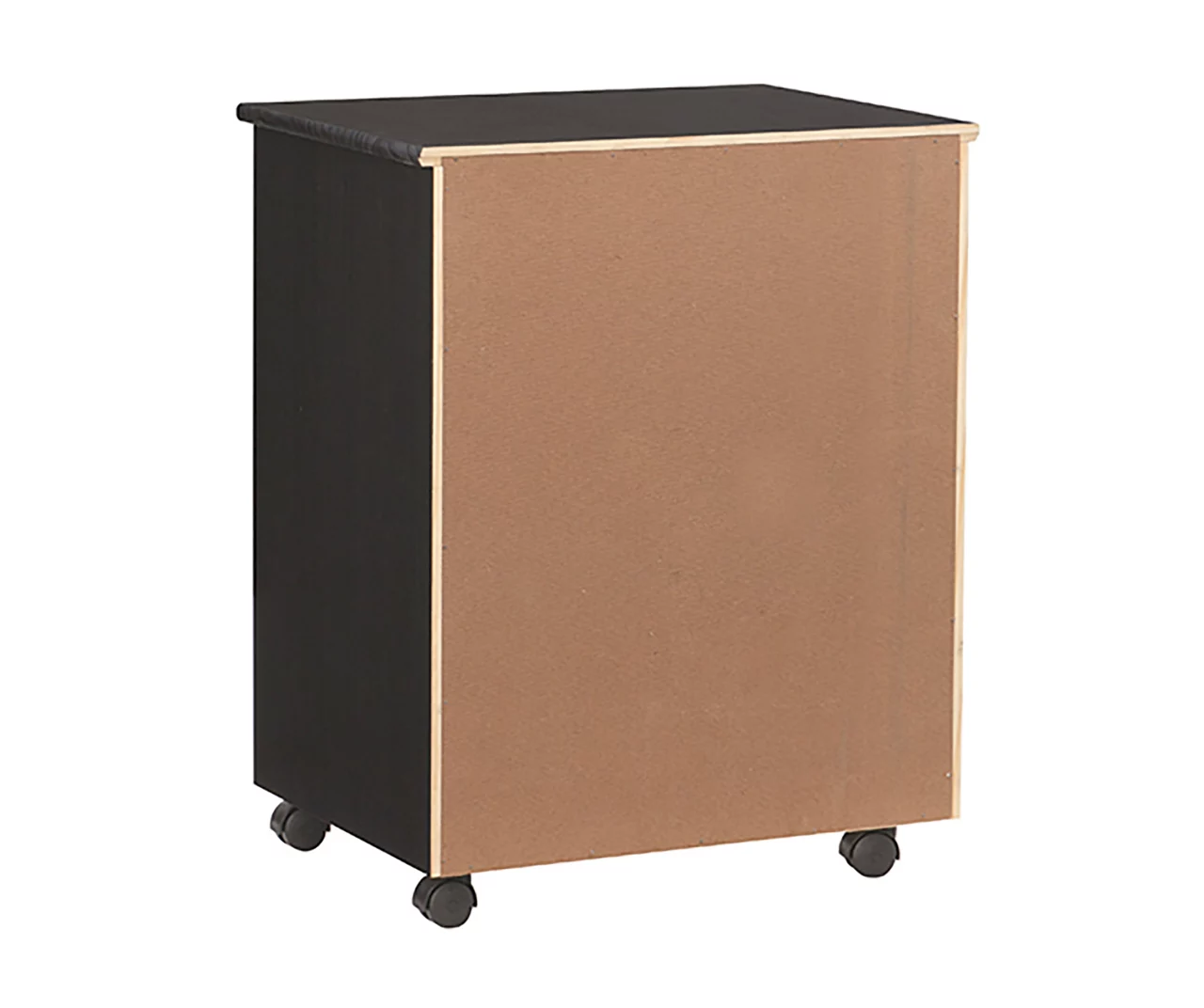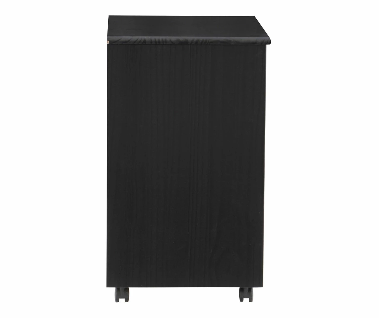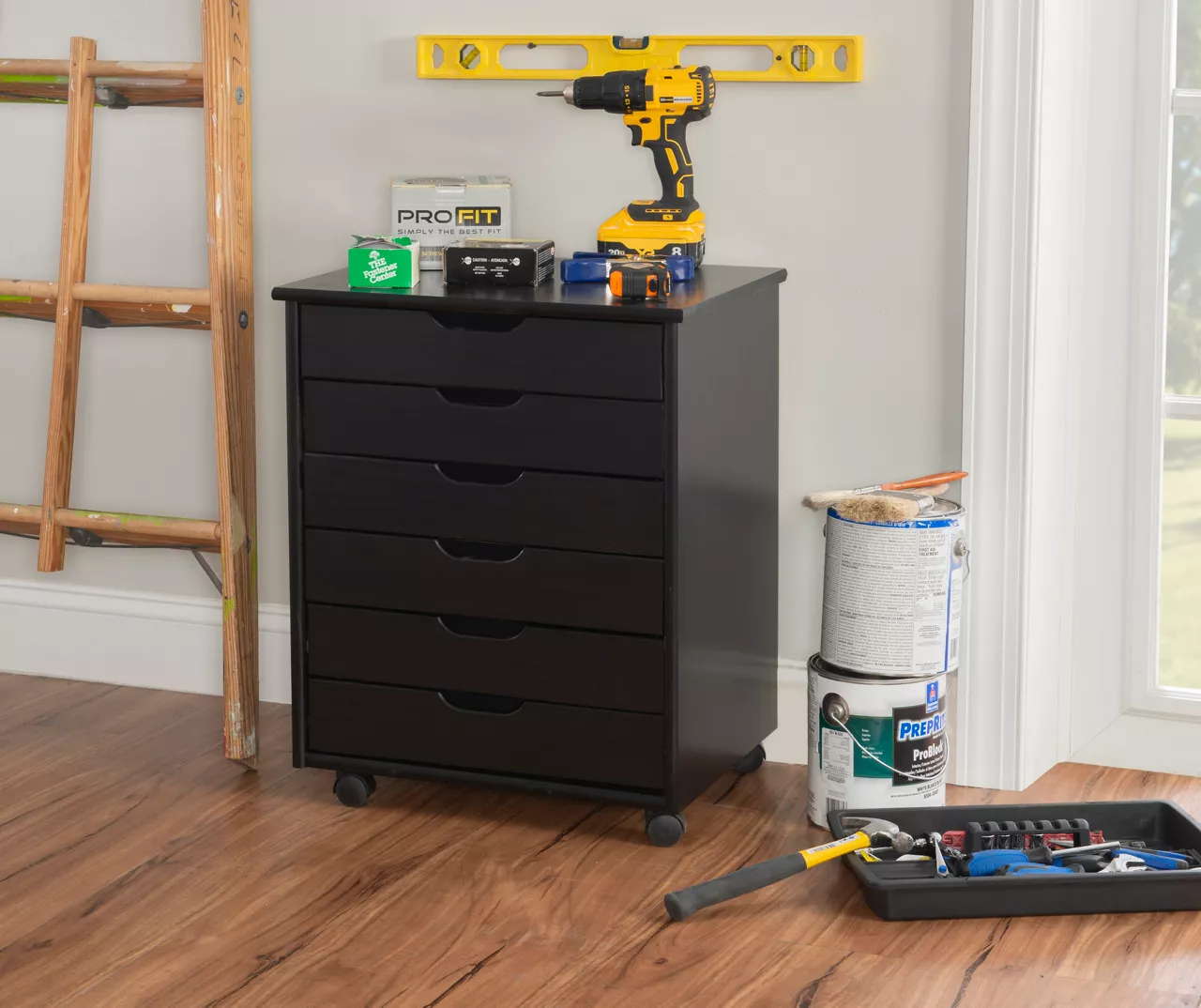 This six drawer rolling storage cart is a versatile storage solution for your office, kitchen, bedroom or anywhere where organization is needed. Solidly constructed from pine wood and finished in a handsome black, the six wide, equal size drawers are finished off with an ample top that can go next to a desk or craft table to put items within reach. Soft contoured handle cut outs are easy on the touch and create a clean, modern look. Drawers can be easily removed and used as a tray to transport your items to your workspace, while casters make this piece mobile to go into any room easily.