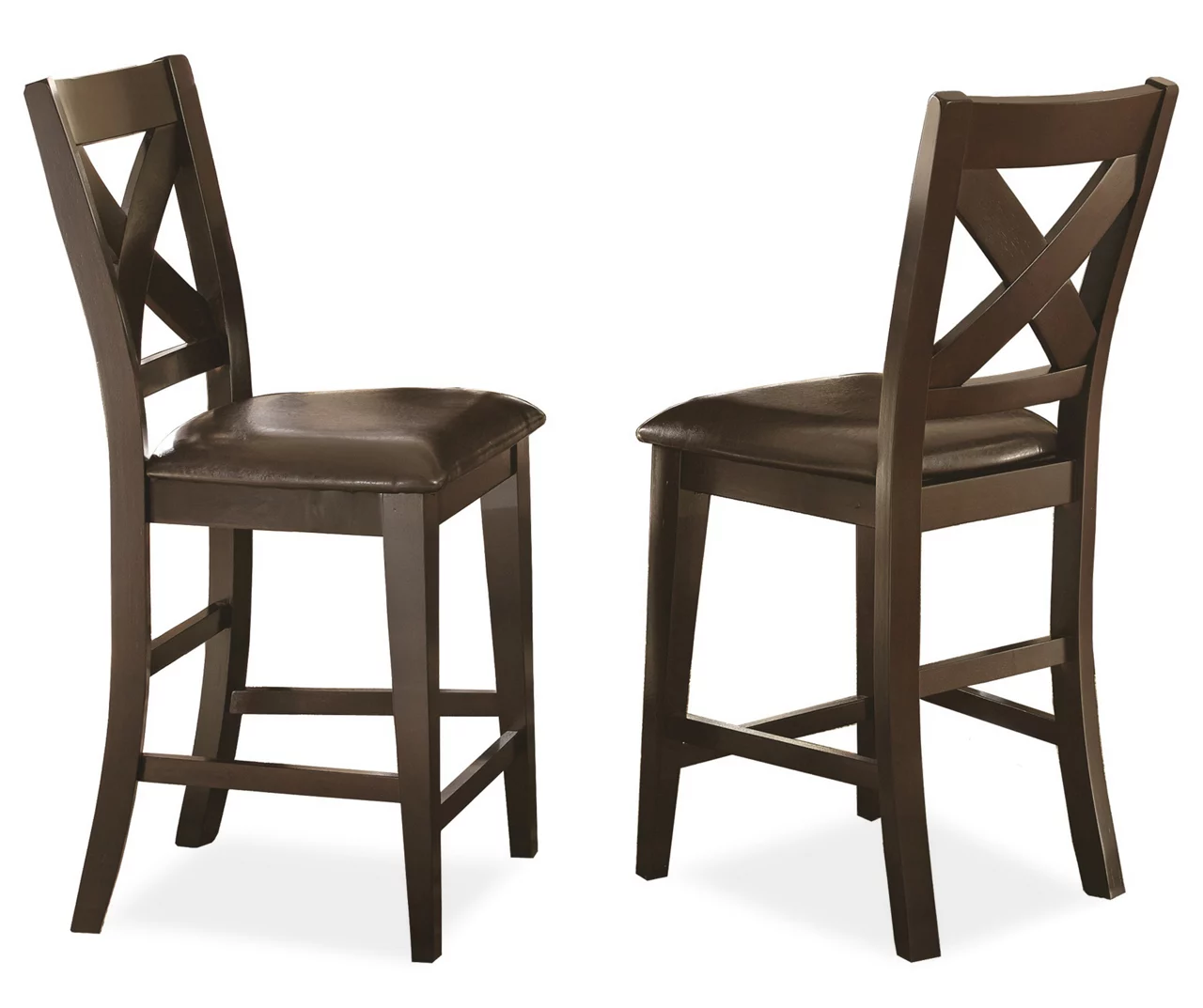 The clean elegance of these Crosspointe counter chairs are distinctive in stylish modern rustic motifs. Made of solid hardwoods with a dark espresso cherry wood finish, each chair features a sophisticated “X” back design and dark brown faux leather upholstered seating.