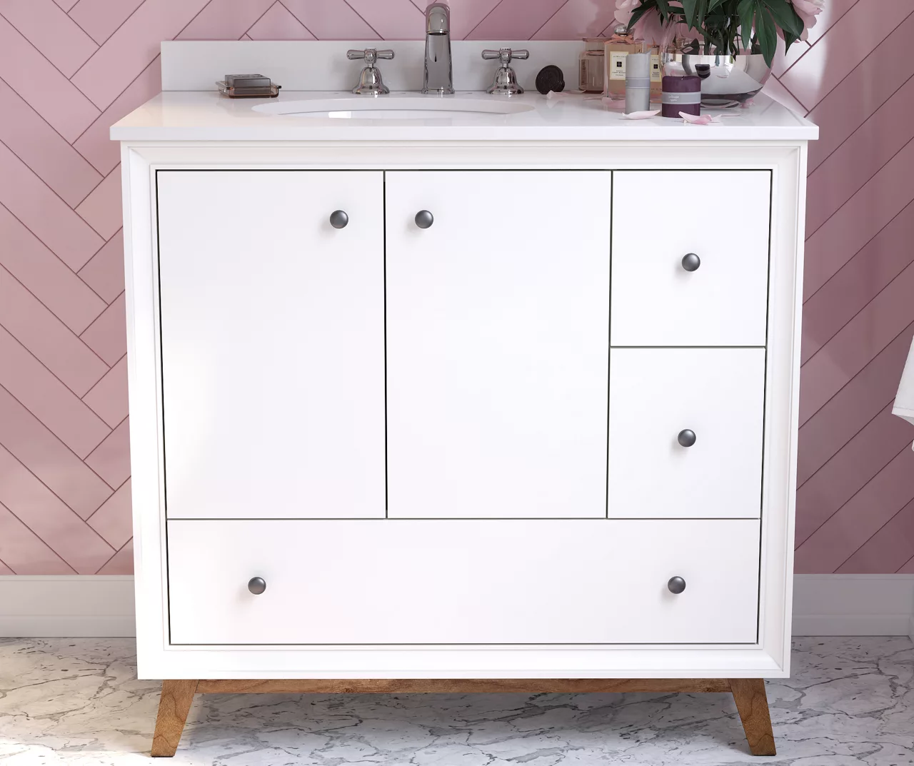 - Mid-century modern style bathroom vanity with slanted feet