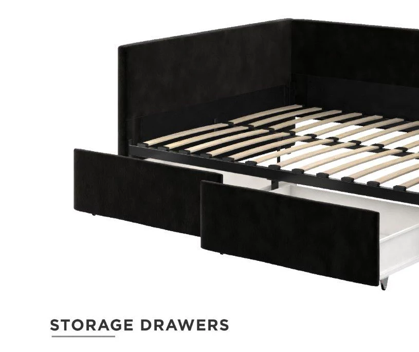 Make a bold statement with the DHP Tallie urban daybed with storage. This multifunctional furniture piece is defined by a boxy, clean-lined silhouette that promises to accentuate the look of your room. Made with a robust wooden frame, this daybed has a wood slat base that helps air circulate better. What’s more, it provides superior comfort without the need of a foundation and accommodates a standard sized mattress. Perfect for small living spaces, the Tallie daybed comes with two convenient drawers on casters that are useful to store personal belongings like extra bedding, accessories and more.
