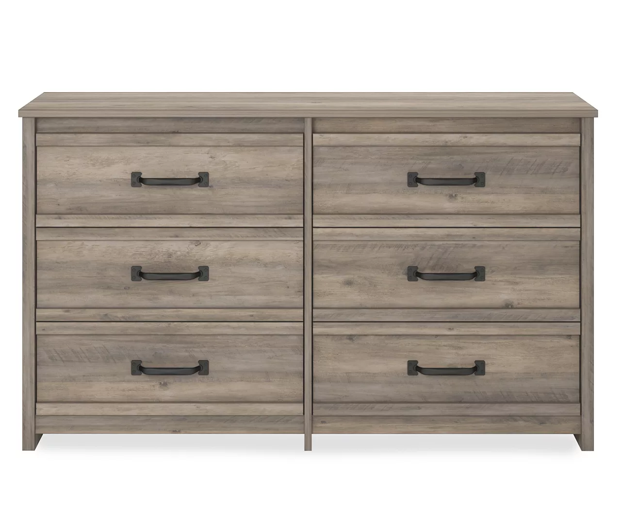 Add the Ameriwood Duncan dresser to create a modern rustic style for your bedroom. The dresser combines a textured distressed gray and brown woodgrain finish with pewter handles to give your bedroom a sleek and updated look that fits any décor. Six drawers give you plenty of storage for your folded clothing or extra blankets as the wide tabletop provides an excellent area to arrange family pictures and display your jewelry.