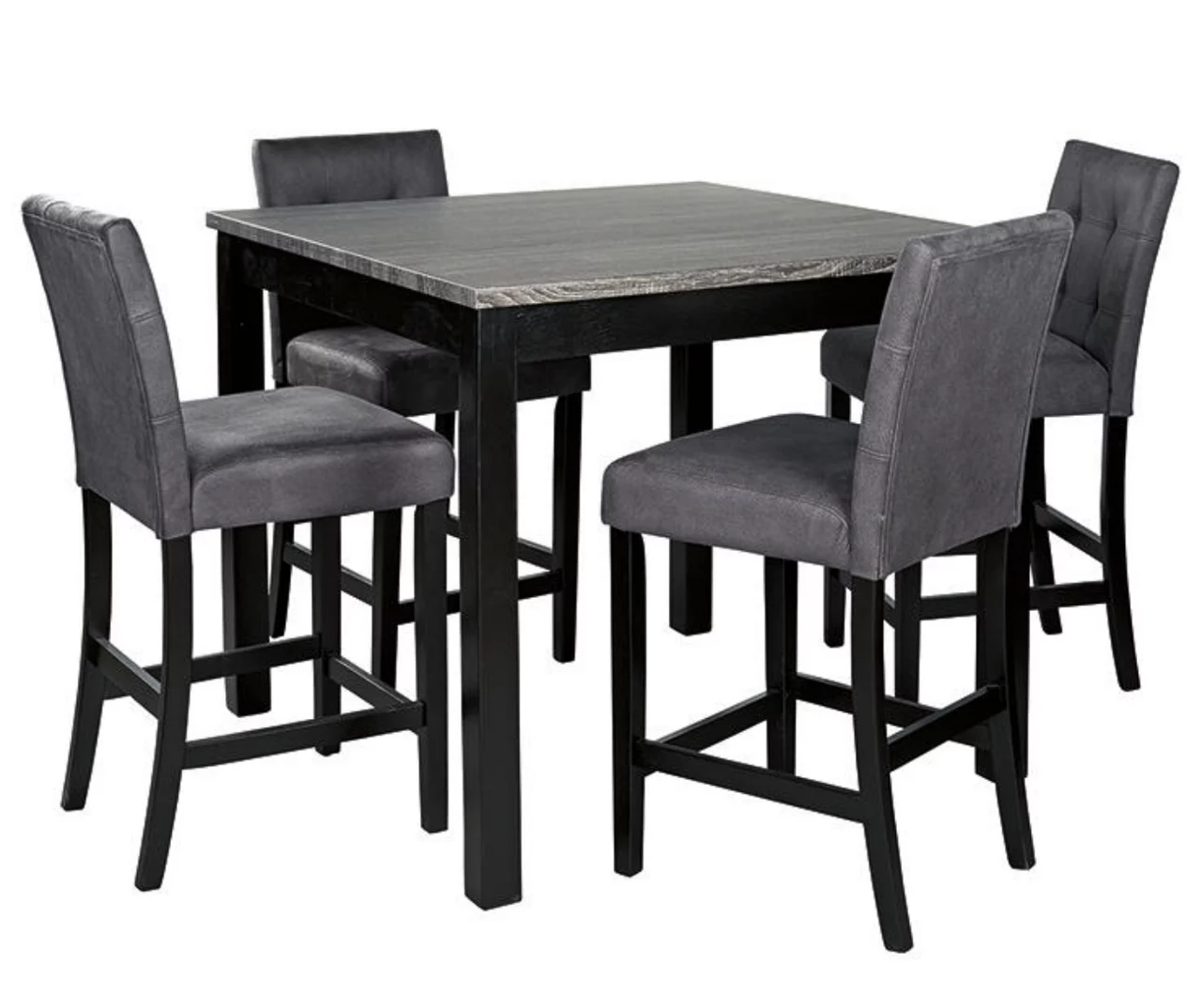 Crafted with a durable melamine surface, this counter-height dining set delivers high style with substance. The replicated wood grain top in dark charcoal raises the bar on casually cool dining. Sleek yet sturdy legs in a matte black finish heighten the contemporary appeal. Add the comfort of cushioned bar stools covered in a textured faux leather upholstery and you’ll find plenty of reasons to linger a little longer at mealtime.