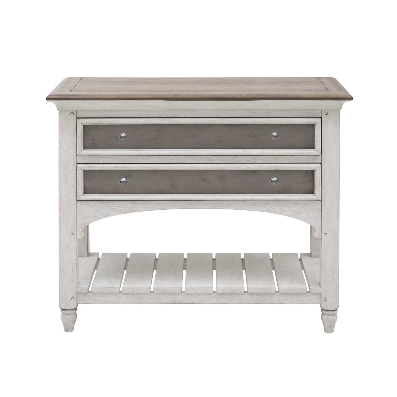 The Glendale Estates nightstand features a fresh traditional styling that creates a handsome functional piece that is impressive, yet approachable. Hickory veneers are enhanced by a distressed white finish. This nightstand provides two drawers for concealed storage as a USB port keeps devices charged.
