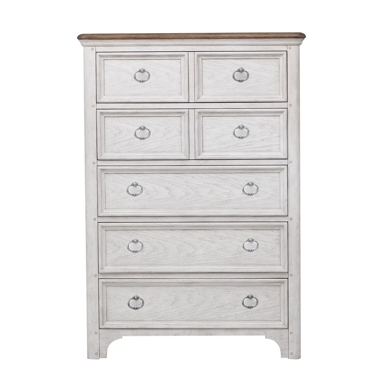 The Glendale Estates storage chest features a fresh traditional styling that creates a handsome functional piece that is impressive, yet approachable. Hickory veneers are enhanced by a distressed white finish. This chest provides seven drawers for concealed storage as a USB port keeps devices charged.