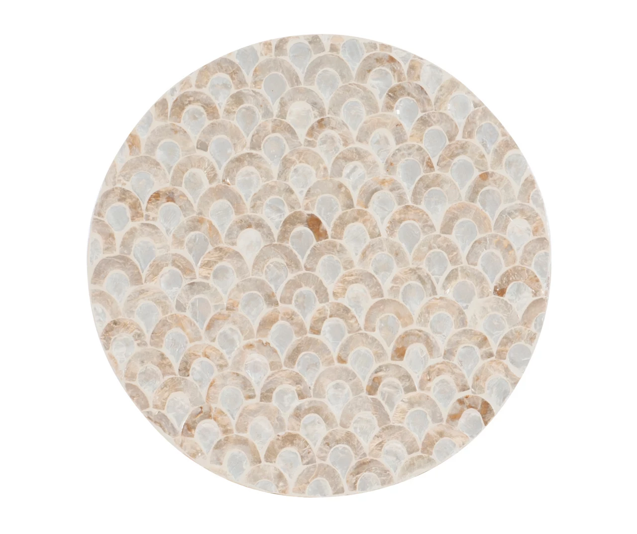 This modern accent table blends subtle shapes and curves with a coastal flare. Adds a splash of accent in event the smallest of spaces. Featuring a gold bent tube frame and neutral capiz shell finish on the table top, this unique piece will serve as a beautiful accent in nearly any decor. This round table is perfect for displaying small decor items such as candles, vases and pictures frames.