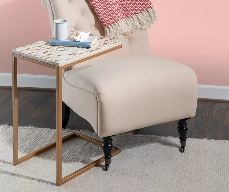 This modern accent table will add a hint of industrial yet coastal flare to any living or office space. Featuring a gold geometric frame and neutral capiz shell finish on the table top, this unique piece will serve as a beautiful accent in nearly any decor. This simple C-frame table is perfect for displaying small decor items such as candles, vases and pictures frames.