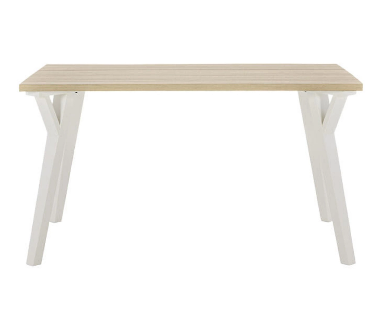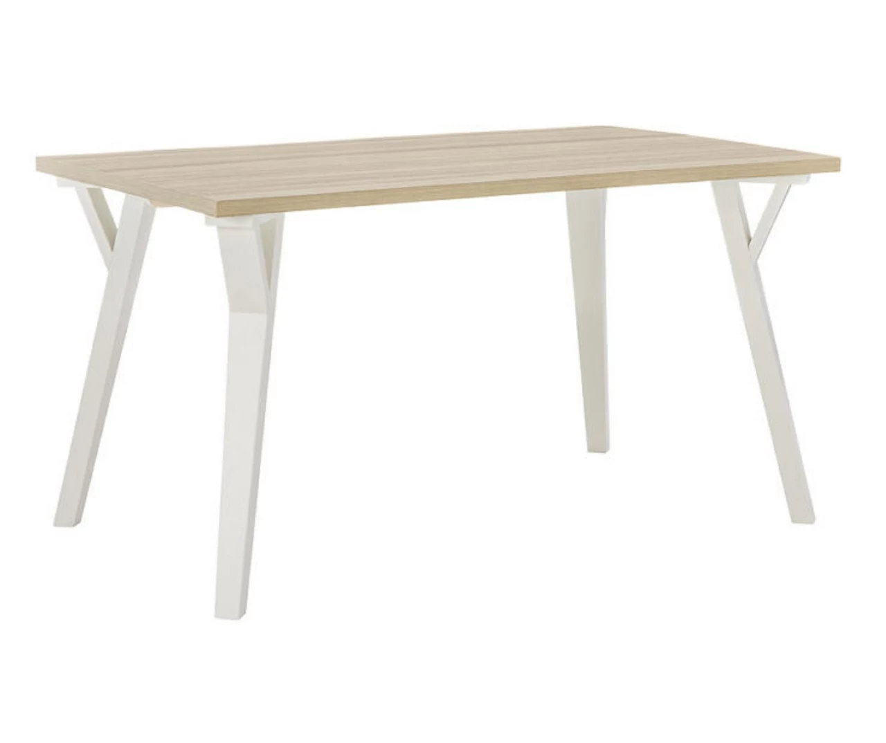 Bring light to your dining area with clean lines and a bright two-tone finish. The rectangular dining table sports stylized saber legs in a white finish for beautiful simplicity. The melamine top in a light tan color provides additional durability, marrying minimalism with big style for a delightful combination.