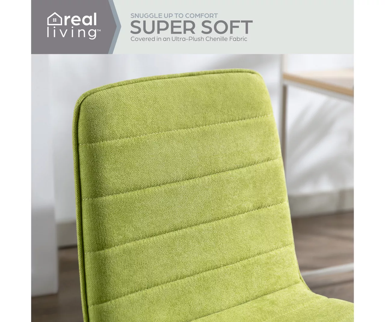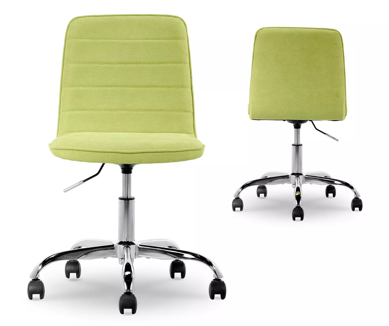 Enjoy superb comfort while staying productive with this chic task chair from Real Living. Swivel, roll and scroll on the soft chenille fabric seat in bright green featuring a padded surface as rolling caster wheels move you around below. Adjustable in height by the lift handle, this armless office chair is the perfect addition to a computer, working or writing desk.