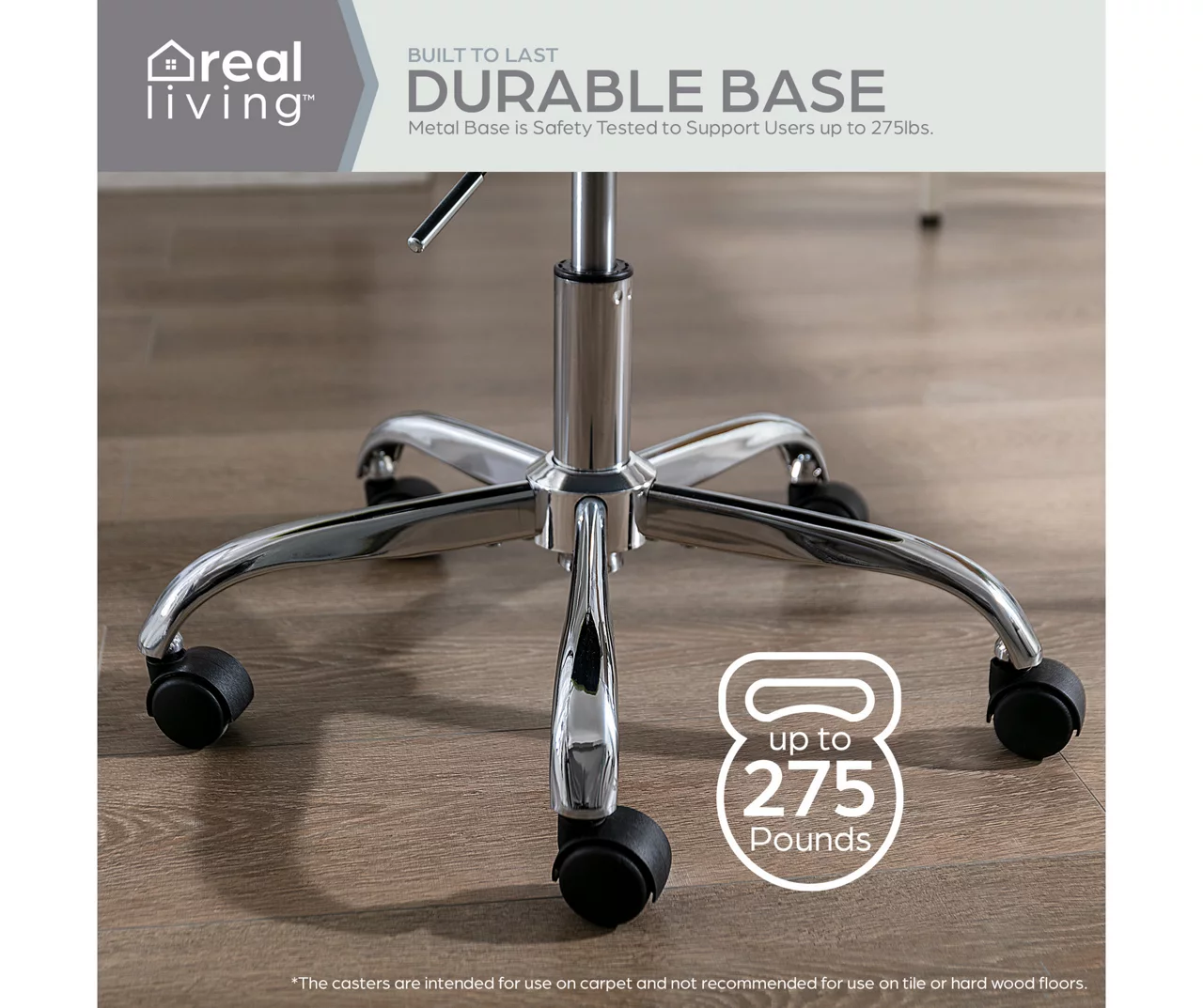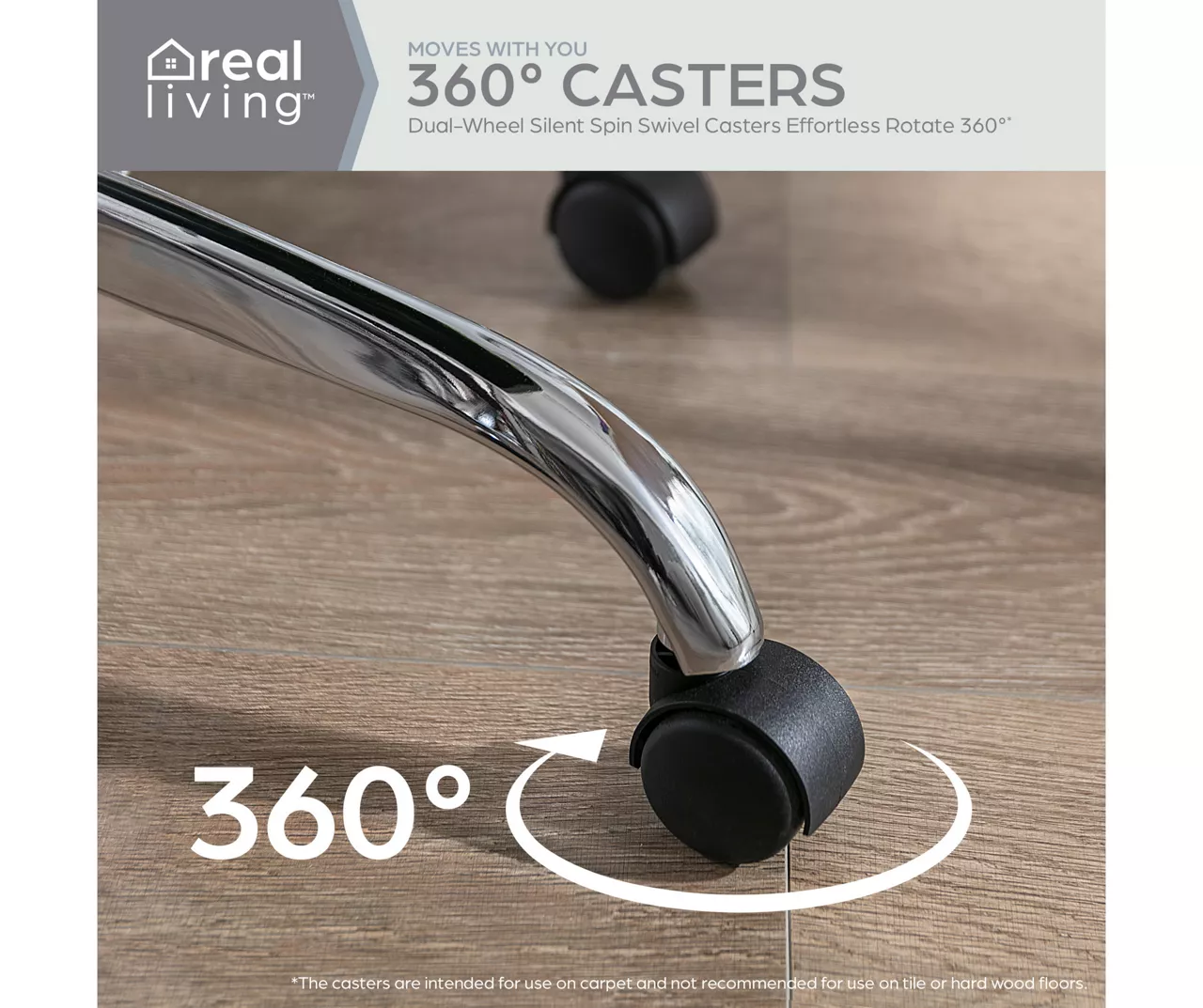- 360° swivel seat and dual-wheel silent spin casters from chrome-finish base