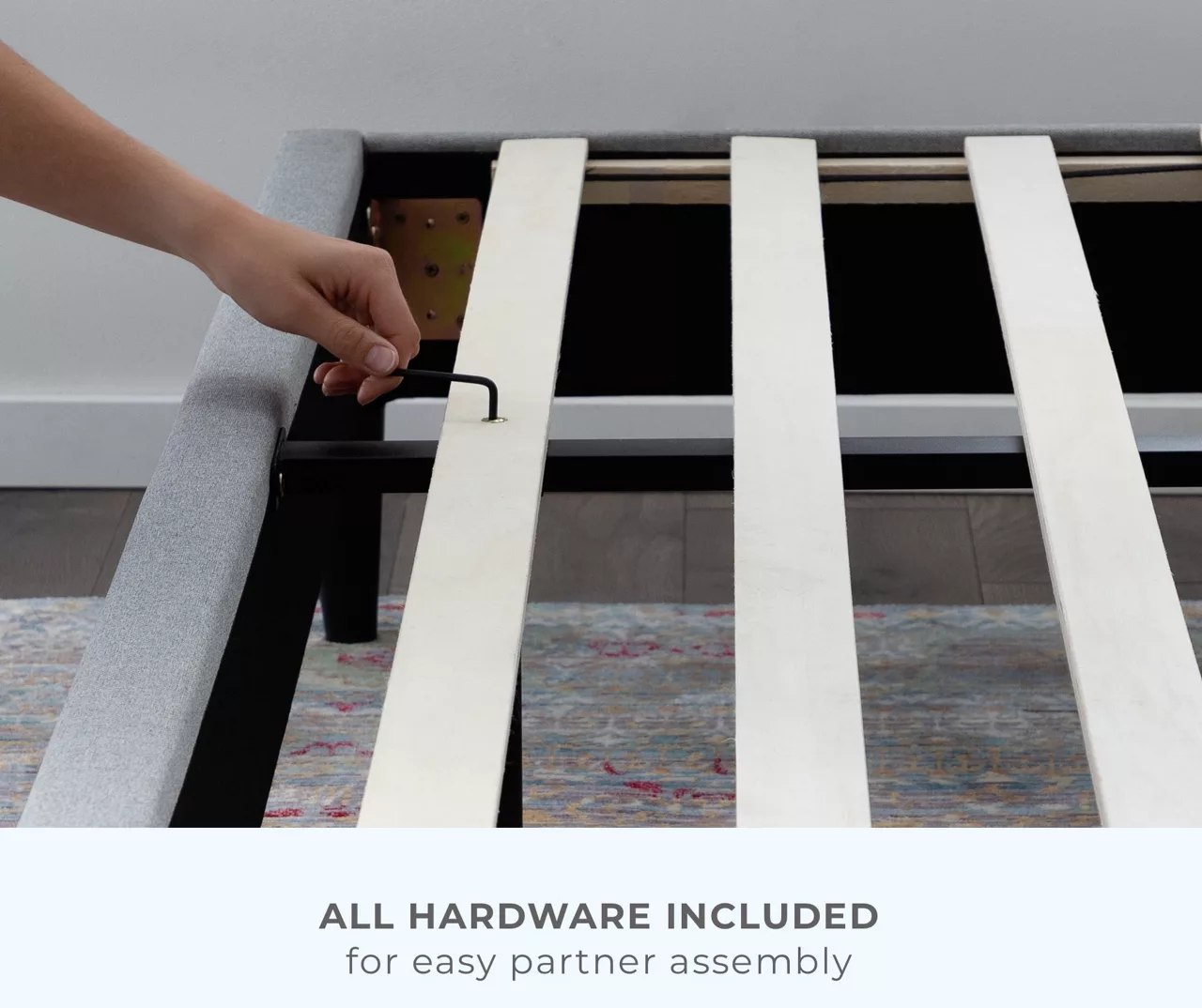 • Includes bed frame, headboard, side and foot rails, legs, 14-piece slat roll and all hardware needed for assembly