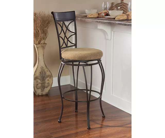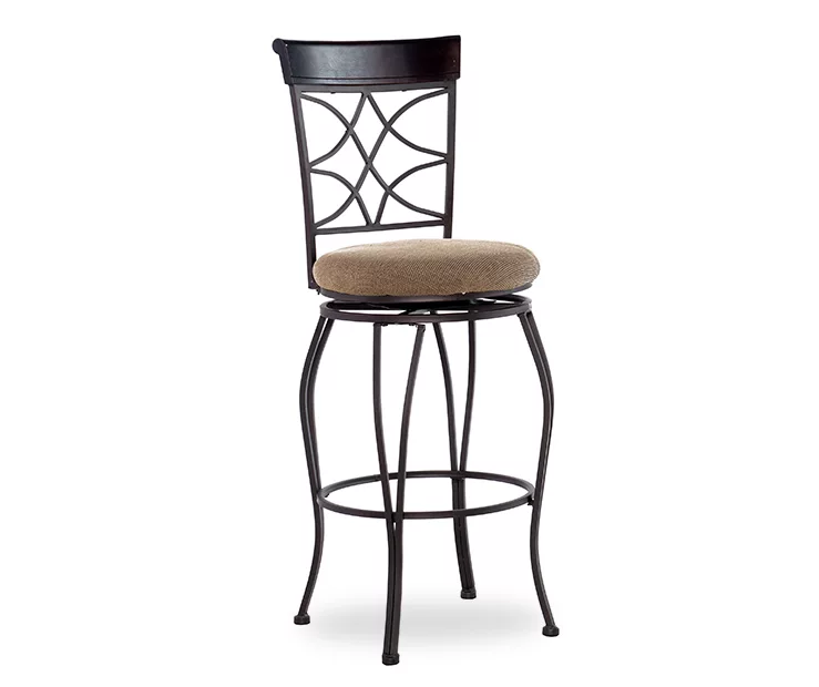 Elegant curves soften the look of this sophisticated bar stool and give it a versatile style that suits any home. Relish in the comfort of a thick, padded seat and foot rests while enjoying a smooth swivel motion. Neutral upholstery complements any color scheme and contrasts with the dark wood and metal finishes. Ideal for a home bar, eat-in kitchen or dining area, this stool offers a distinctive appeal that fits any space.