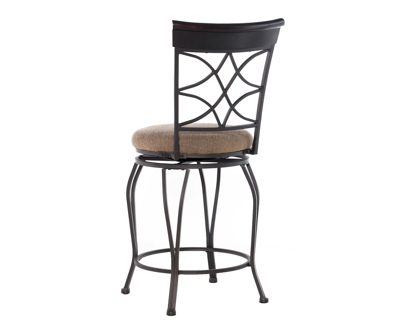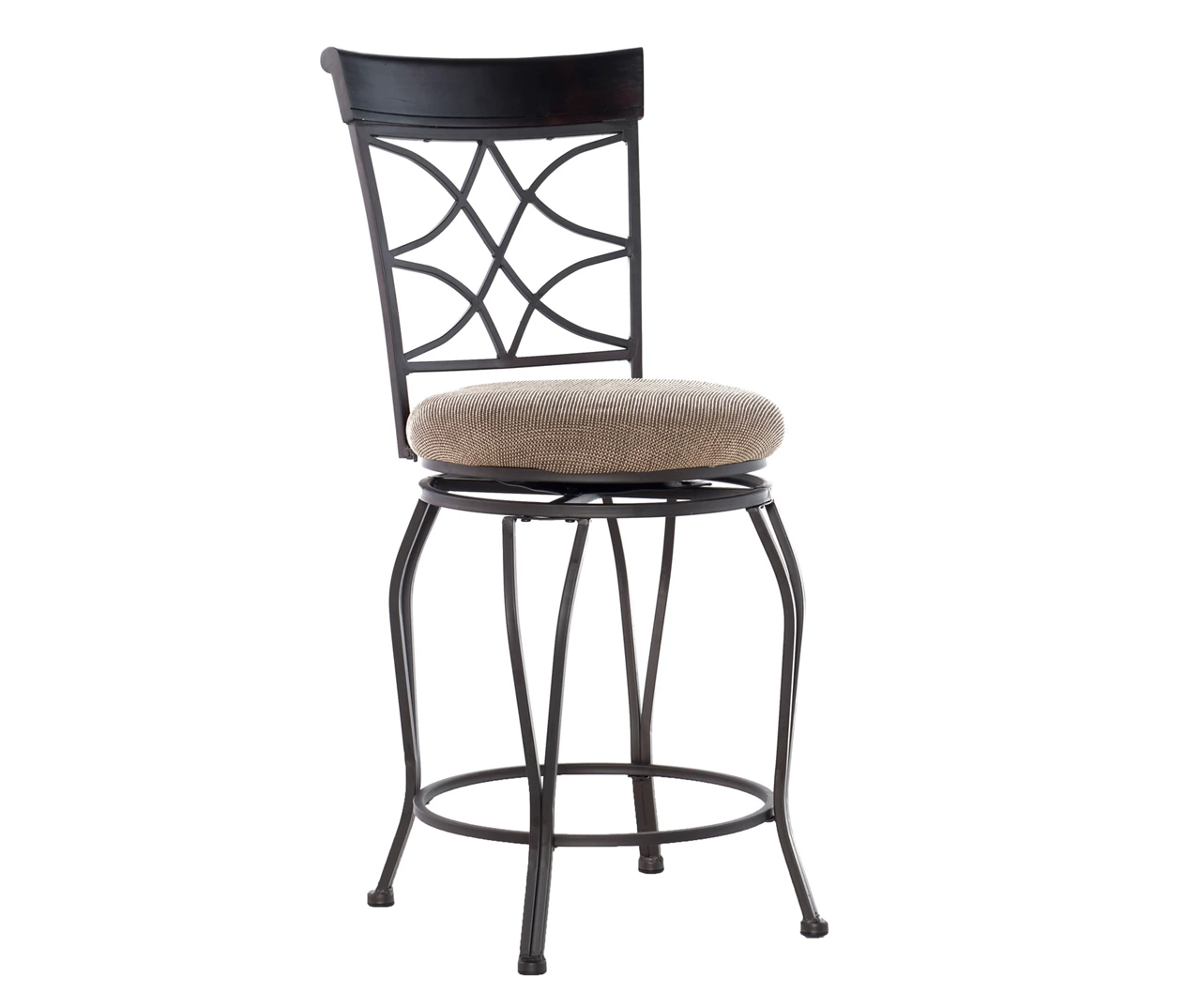 Elegant curves soften the look of this sophisticated counter stool and give it a versatile style that suits any home. Relish in the comfort of a thick, padded seat and foot rests while enjoying a smooth swivel motion. Neutral upholstery complements any color scheme and contrasts with the dark wood and metal finishes. Ideal for a home bar, eat-in kitchen or dining area, this stool offers a distinctive appeal that fits any space.