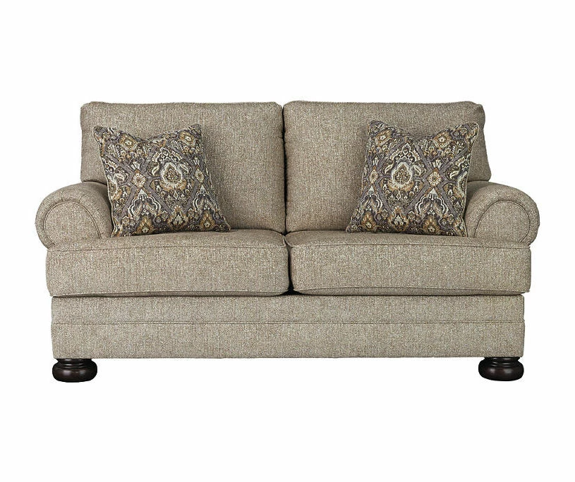 The sumptuously styled Kananwood loveseat proves that a richly traditional look doesn’t have to break the bank. Flared effect gives the classic roll arms a relaxed feel, while the choice of a plush chenille upholstery in oatmeal is earthy elegance at its best. Distinctively turned bun feet in a dark finish add to the loveseat’s substantial presence.