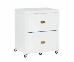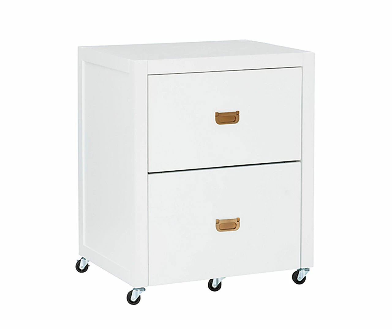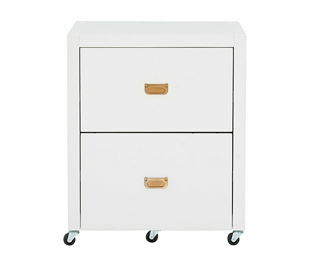 Get organized with this handy two drawer filing cabinet. Rolling and locking casters allow for mobile storage, while metal drawer glides and shiny gold campaign style handles provide easy access to documents. With a small and compact design, this cabinet is easy to tuck into a corner and acts as the perfect stand for a printer. The bottom drawer is designed for standard or legal sized filing and the top is convenient for miscellaneous supplies. A clean white painted finish pairs well with any home décor style.