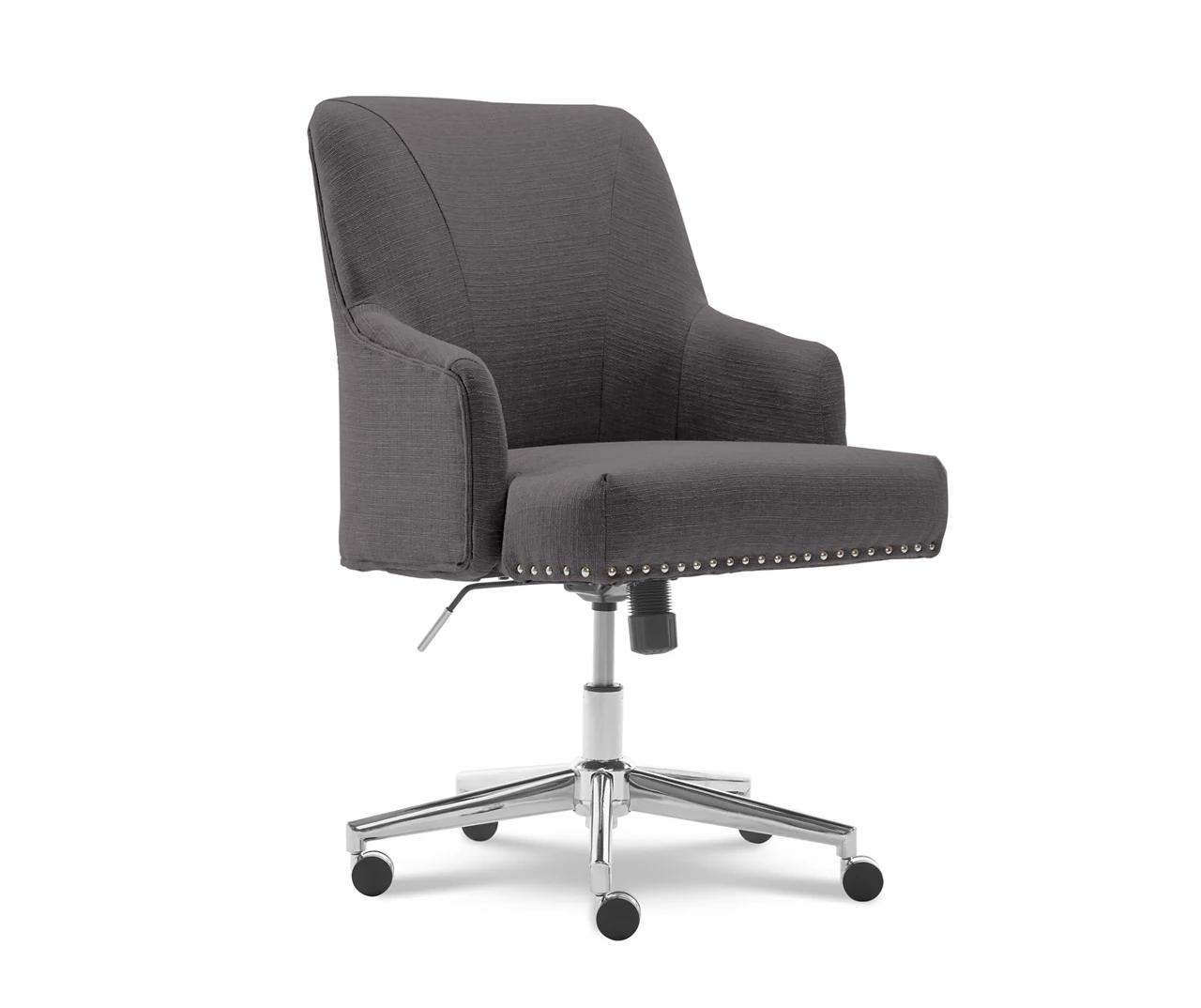 - Dark gray fabric desk chair with silver nail head trim