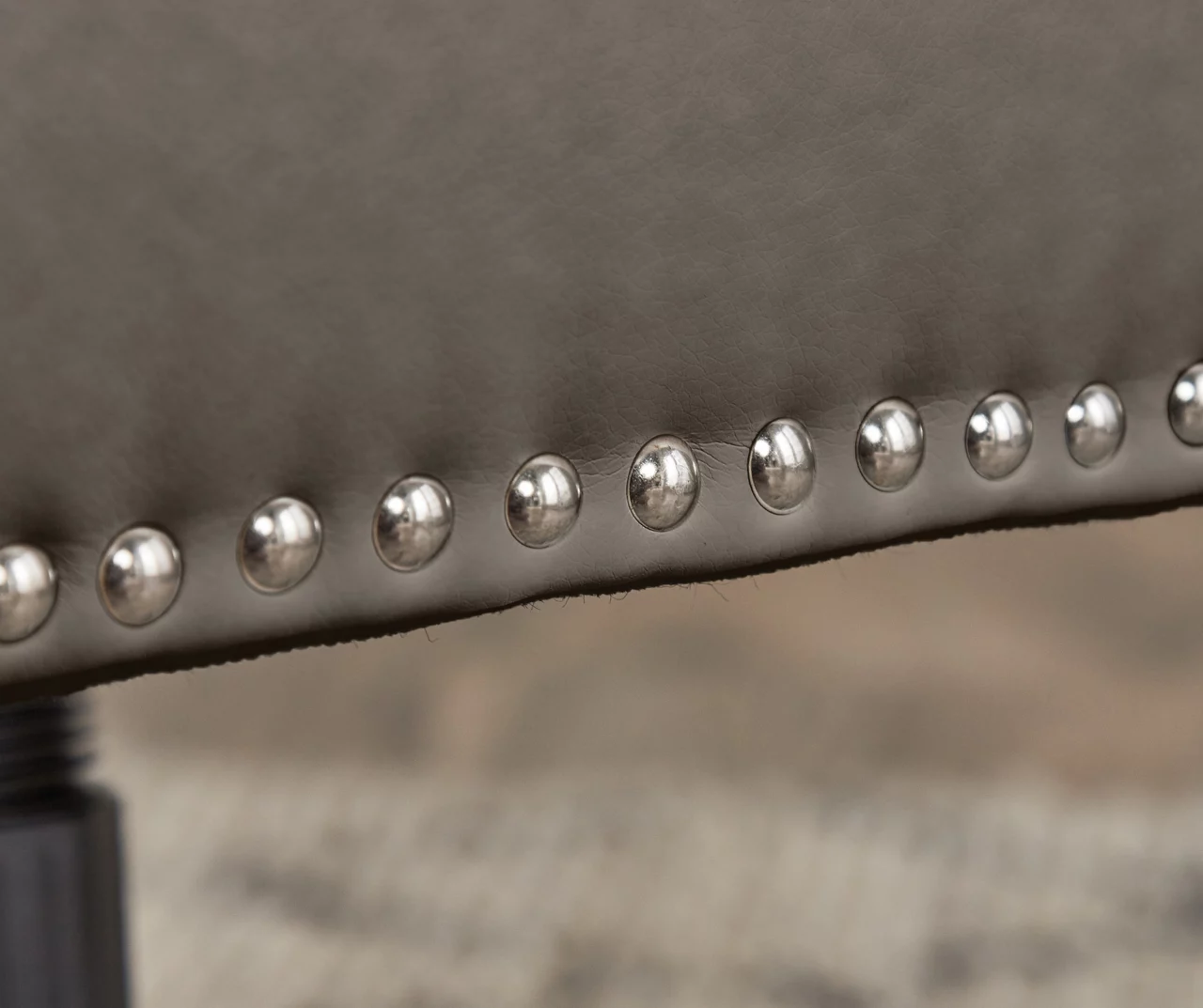 Say hello to your new favorite work colleague, the Leighton desk chair. You’ll sink into its soft memory foam cushions and never go back to any other office chair again. Its silhouette descends graceful arms from its barrel back to embrace a comfortably cushioned seat that’s accented with nail head trim. And if you’re always on the move, the durable rolling casters are suited for any floor type. A combination of handsome bonded leather and crisp chrome detailing, this desk chair easily transitions between traditional and modern decor.