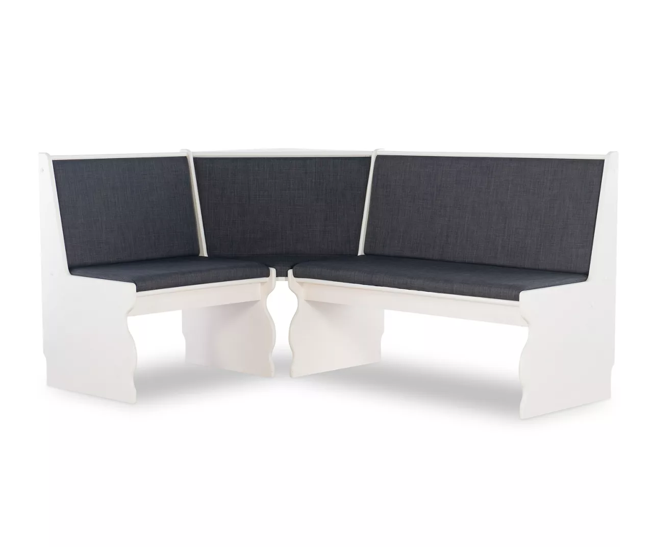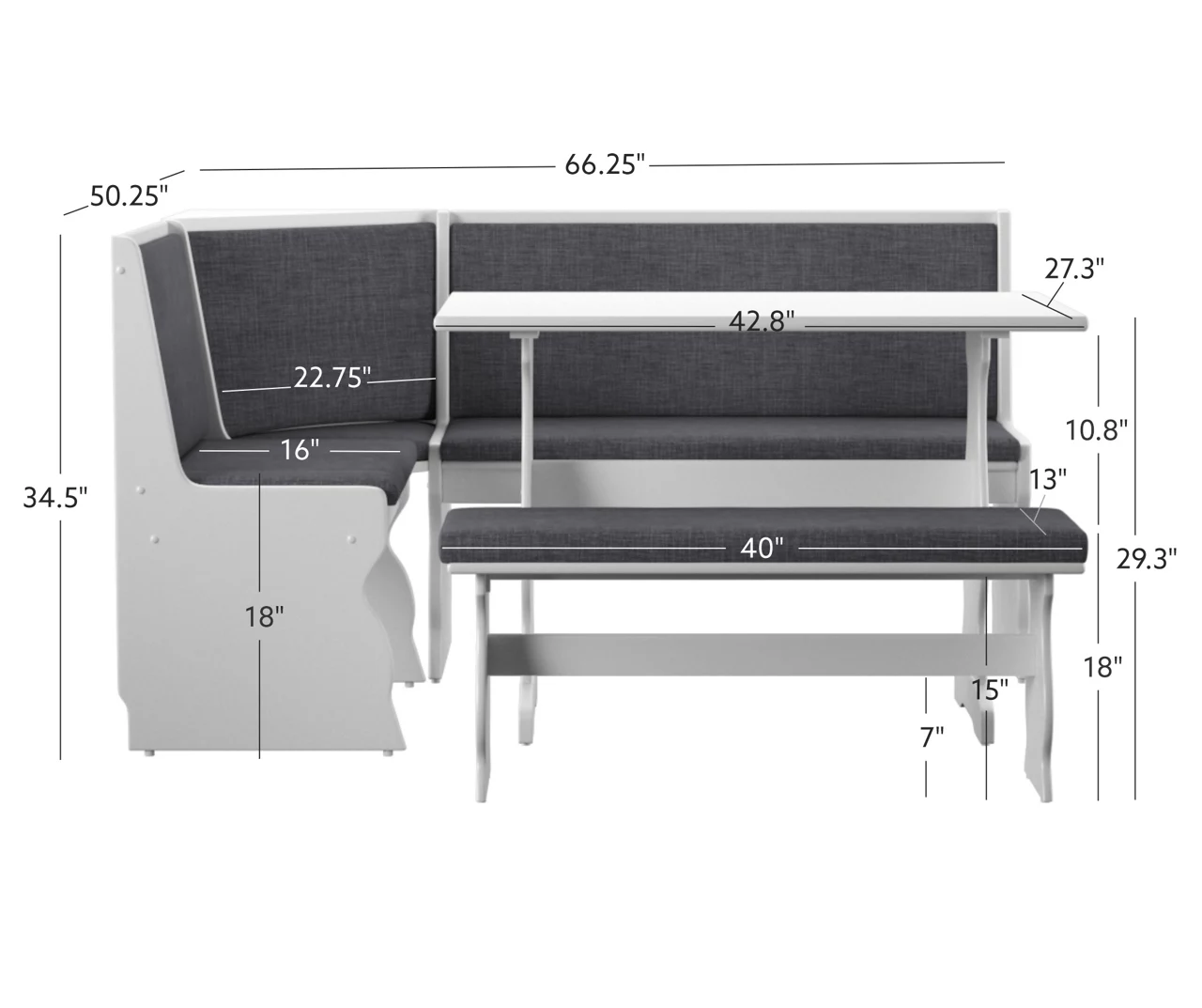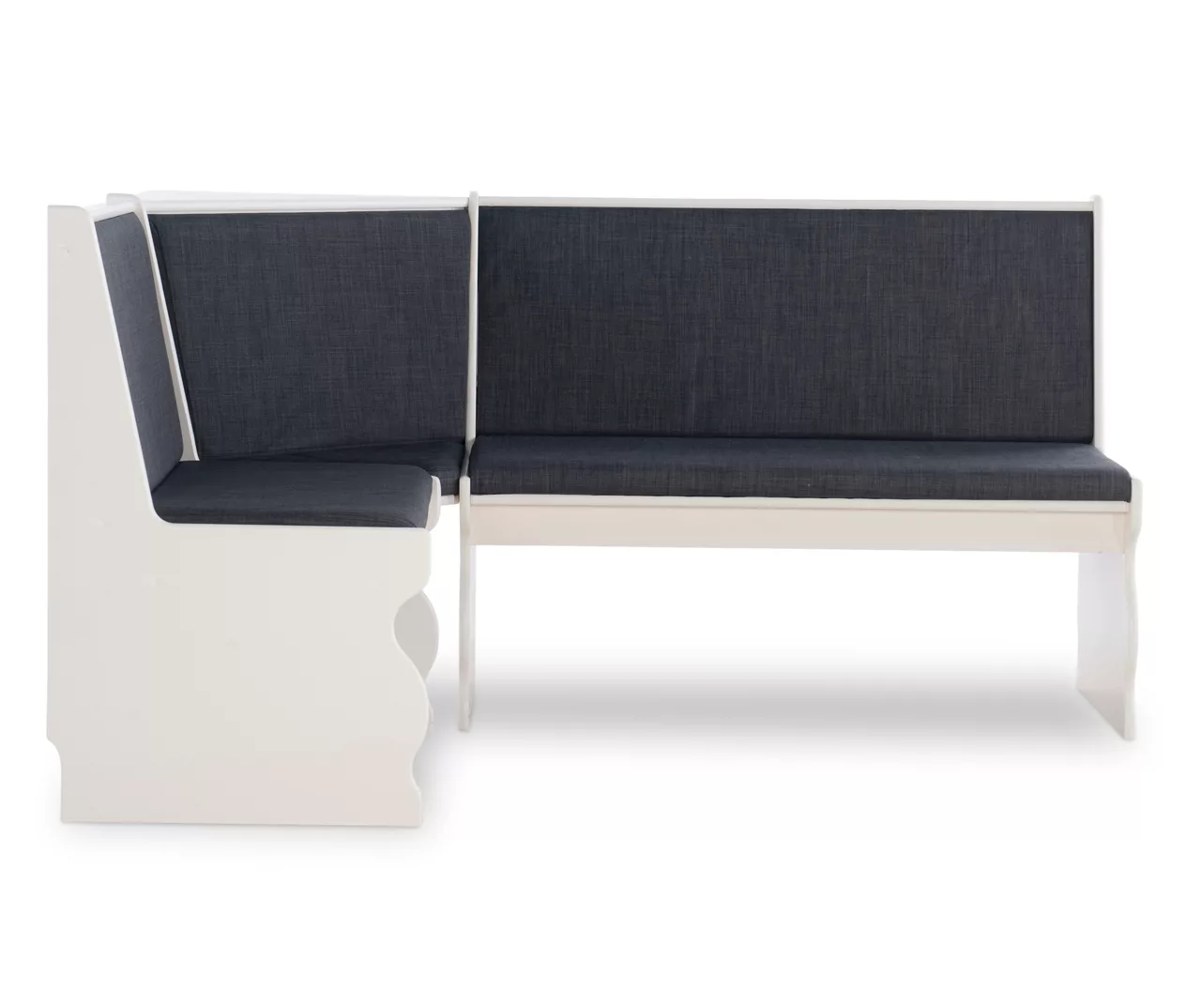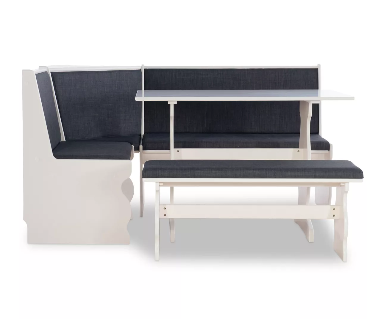 Create cozy kitchen comfort even in the tiniest of spaces with this lovely Maggie dining nook! Padded seating in charcoal gray pairs well with the classic white look of the set’s pine constructed frame. Generously sized to accommodate up to five people, this wonderful furniture set is perfect for any corner of your kitchen.