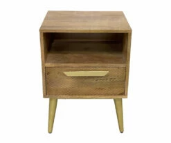 Stow away your bedside items in mid-century modern design using this Real Living table. The square design is made from solid mango wood with open and closed storage. Complete with metal tapered legs, this side table is an elevated addition to your master or guest bedroom.