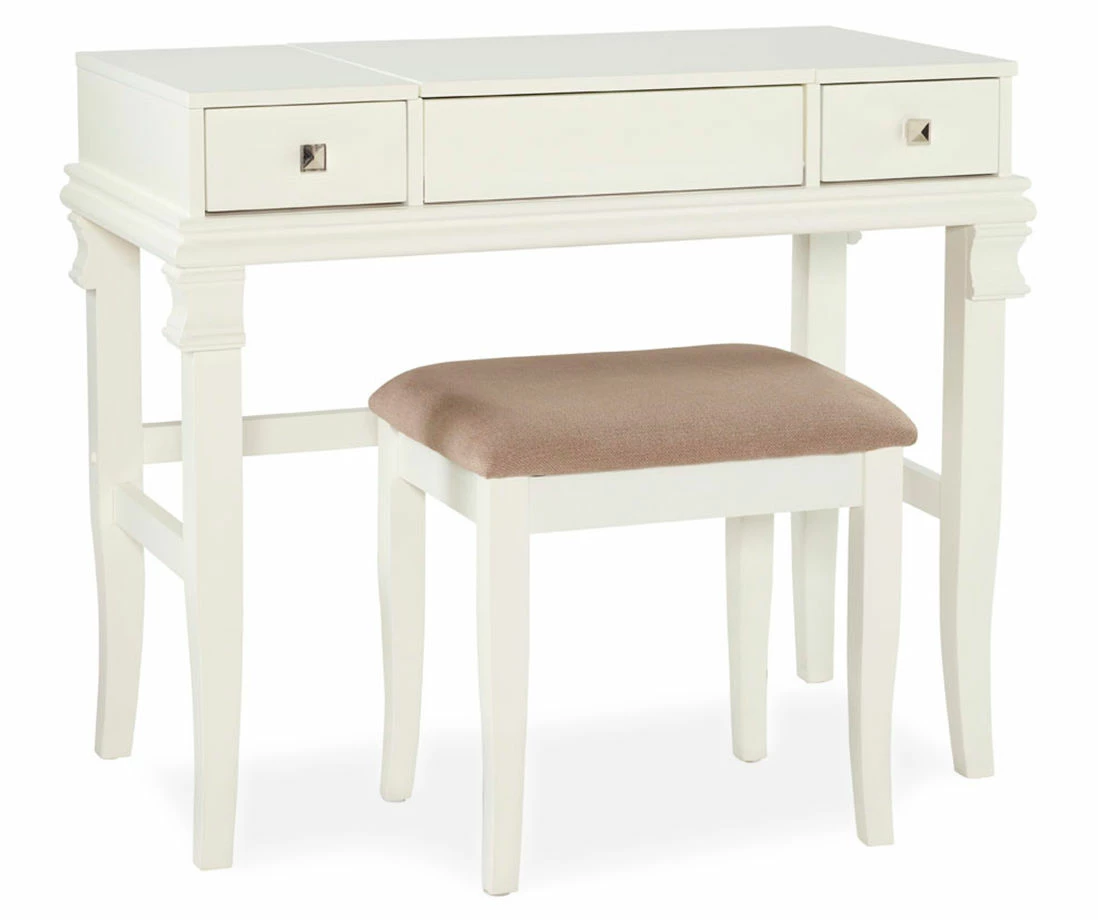 A classic, timeless accent piece for all your beauty needs, the Marta vanity with color matching stool is perfect for getting ready for the day in a large bathroom, bedroom or dressing area. A flip top mirror hidden in the vanity’s spacious table top features open underneath room for hair brushes and beauty necessities. Cord management holes in the back make using and storing a flat iron or hair dryer easy. Side drawers accented with square drawer pulls provide ample space for smaller items as you use this table to apply makeup and fix your hair. Finished in white for added sophistication to your décor.