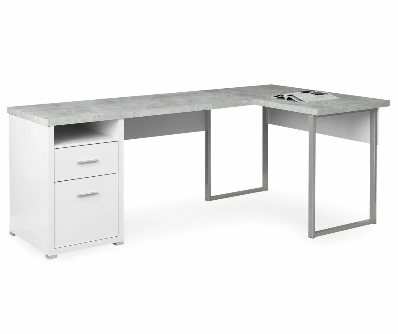 “L” stands for more than just the shape of this computer desk. It stands for “lots” of convenience and room to work. This corner desk in a gray finish has a reversible configuration so you can set up the side with the storage unit on the left or right according to your preference. The one cubby and two storage drawers, one of which is designed for letter or legal-size hanging files, help to keep the desktop clutter free. Providing support for the spacious desktop are two robust, rectangular metal legs in a contrasting silver finish. This L-shaped computer desk saves space when used in a corner but is finished on all sides for a polished look wherever itis placed in a home office.