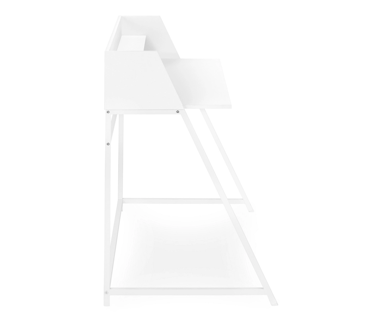Look at your home office from a different angle with this computer desk featuring a storage hutch. The compact desktop has side panels that slant to seamlessly align with the attractive, trapezoid-shaped metal legs for a clean look. The hutch includes a long shelf that is the ideal size to hold small items like wireless speakers or a block of sticky notes. Supporting the desktop is a sturdy metal base with a support bar on back that runs parallel to the shelf. This contemporary laptop or writing table with a space-saving design is a great choice if you use your living room or bedroom as a home office.