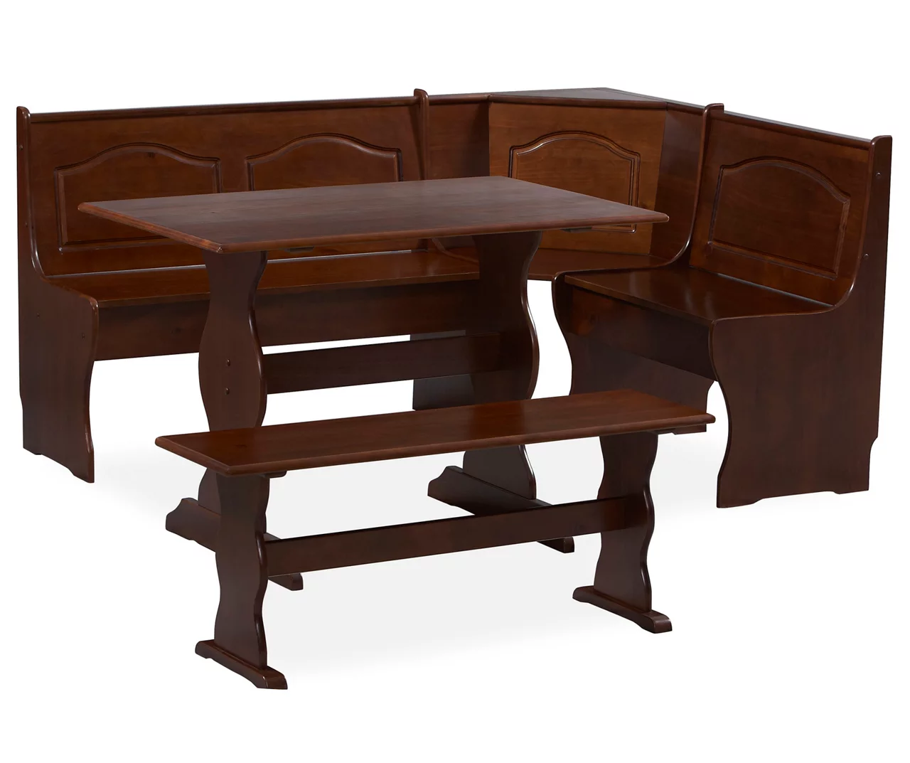 The rich walnut finish on this Morgan corner nook provides a traditional look in your home. The nook corner bench and nook free-standing bench seats five people comfortably. You can determine the direction of the corner unit during nook assembly. Create a cozy spot for meals and conversation in any corner of the kitchen!
