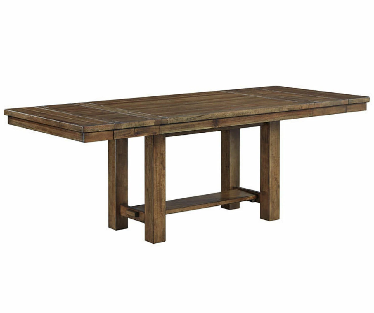This dining room extension table elevates the art of casual rustic style. Clean-lined, farmhouse profile is beautified with a distressed nutmeg finish and thick planked effect top for added charm. And with not one but two drop-in leaves, you can easily accommodate eight with plenty of elbow room.