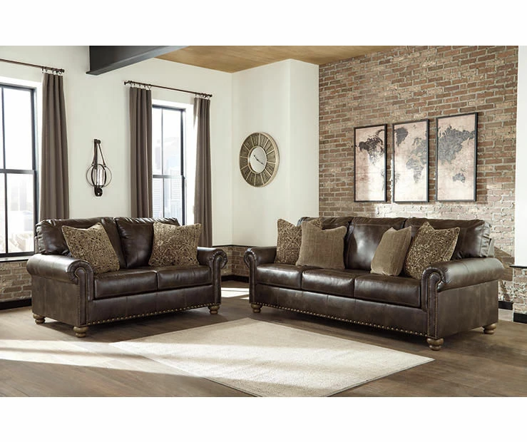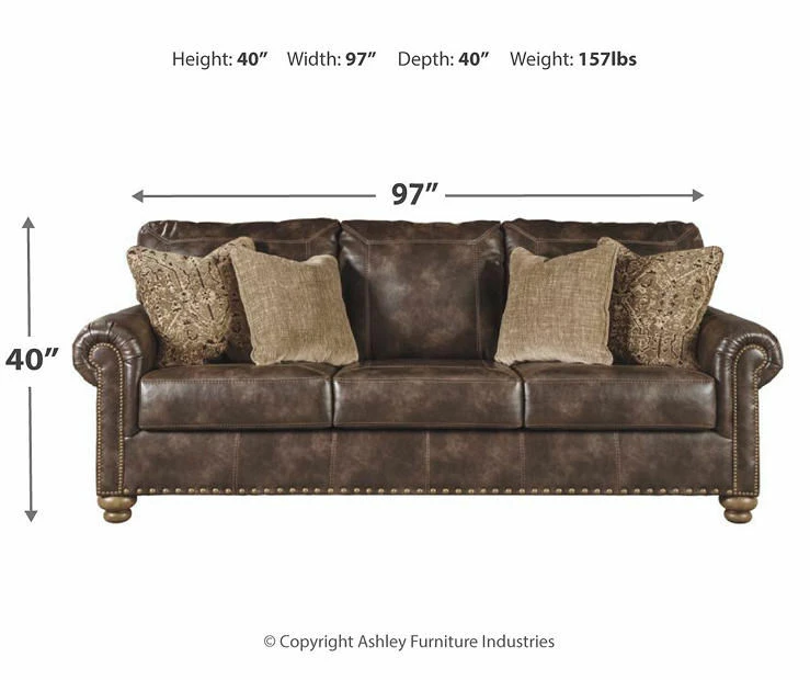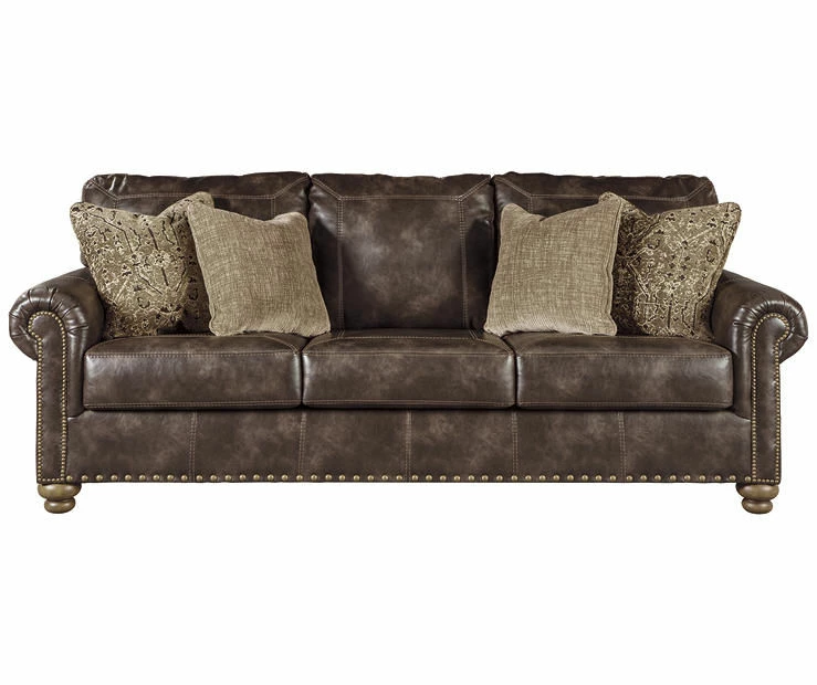Enticing with a coffee brown faux leather, beautified with a gently weathered effect and designer stitching, the Nicorvo sofa merges a richly traditional sense of style with modern comfort. Roll arms, turned bun feet and prominent nailhead trim incorporate distinctive character. Four plush accent pillows are a sumptuous touch.