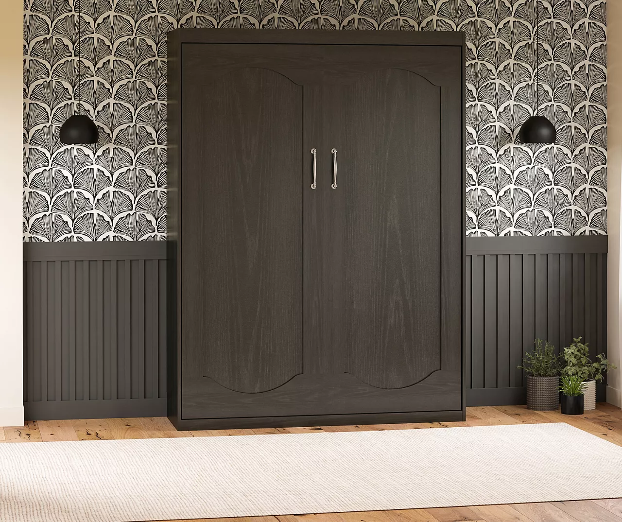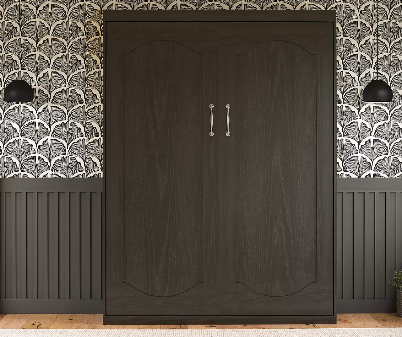 You really can have it all and live like royalty with the Novogratz Her Majesty wall bed. Turn your guest room into a home office or transform a bedroom into a fabulous workout space in minutes with this versatile bed design. The compact style allows you to easily stow away your full-size bed by folding it against the wall whenever you need floor space. The durable metal folding mechanism allows one person to simply fold or unfold the bed. The wooden mattress support slats eliminate the need for a box spring, while the sturdy metal bed frame will prevent sagging. This wall bed is also ideal for loft-style apartments or bonus rooms that need extra sleeping spaces. Made of durable industrial-grade laminated MDF and particle board, the Her Majesty wall bed is finished in a versatile black oak woodgrain laminate, complete with ornate decorative molding.