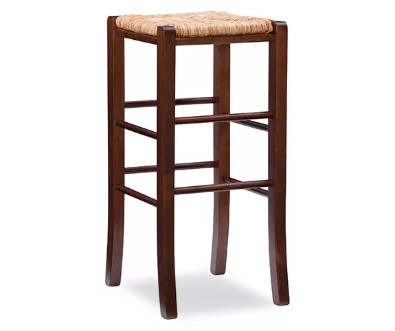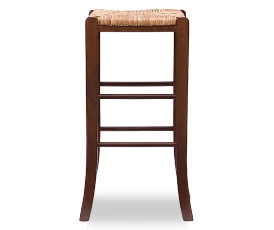 Modest and reliable, this classic bar stool is the unsung hero of countless family gatherings. The solid beechwood frame is stained in a dark walnut finish and is accompanied by handwoven rush seating as an ode to the countryside. Curved legs are supported by rungs that double as footrests for extra comfort and stability. With a backless design measuring 29” high, this European made stool can easily be tucked away under a bar or pulled out for extra seating.
