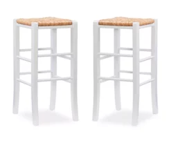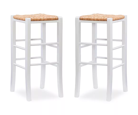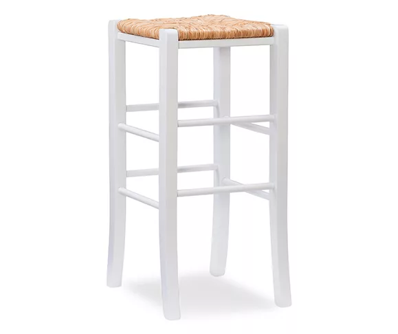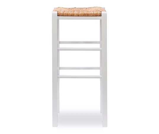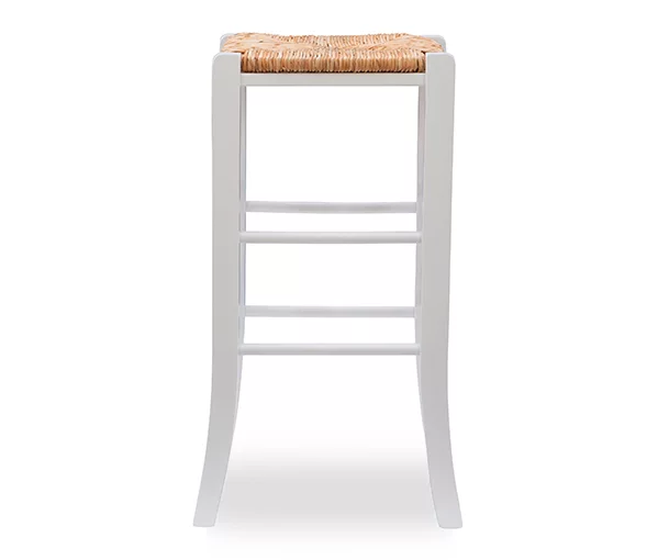 Modest and reliable, this classic bar stool is the unsung hero of countless family gatherings. The solid beechwood frame is painted in a sleek white finish and is accompanied by handwoven rush seating as an ode to the countryside. Curved legs are supported by rungs that double as footrests for extra comfort and stability. With a backless design measuring 29” high, this European made stool can easily be tucked away under a bar or pulled out for extra seating.