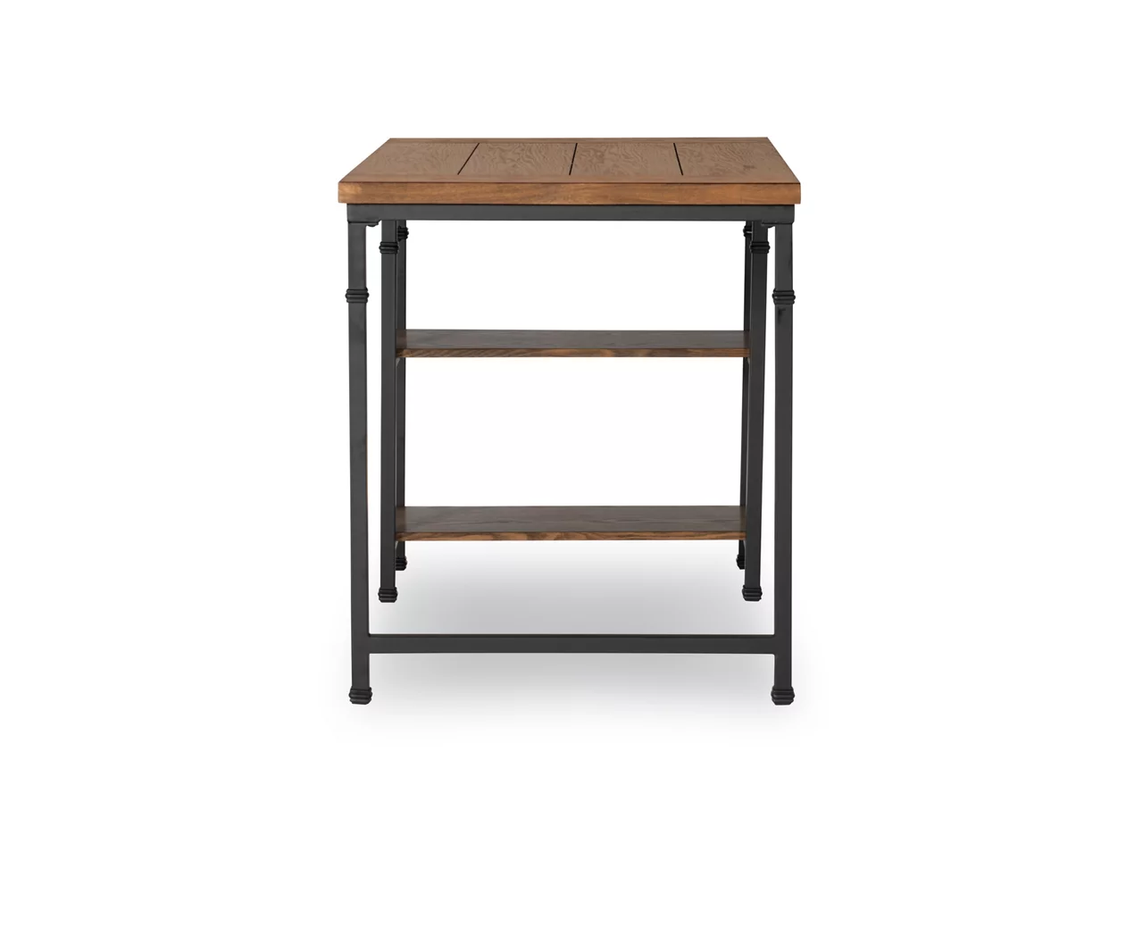 With industrial finishes and a classic design, this desk brings a robust look to any setting. Sharp lines showcase the beautiful ash wood veneer while a black powder coat finish completes the look with rich color and durability. A sturdy top and two tiers of side shelves add ample display space for decorative accents.