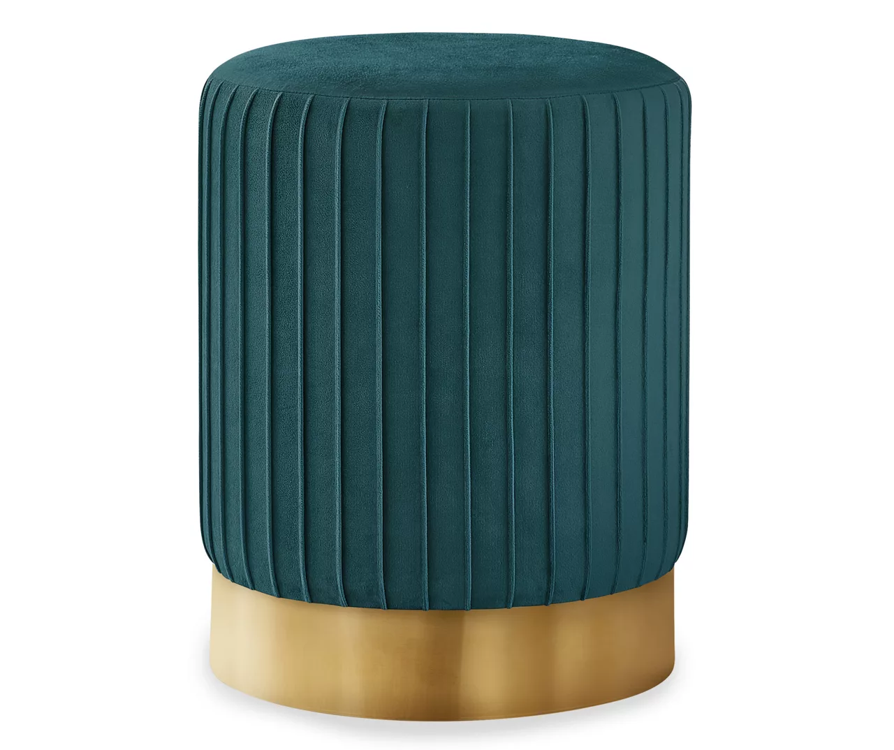 This exceptional ottoman commands attention with its unique cylindrical shape and distinctive details. Upholstered in a blue velvet fabric with a luxurious feel, the tall sides are pleated for visual and textural appeal while the padded seat is smooth to offer superior comfort. A sturdy metal base finished in lustrous gold completes the modern glam look. As versatile as it is chic, this round ottoman is ideal as a living room foot rest, a makeshift table to place a book or tray or as a pouf wherever you need an extra seat.